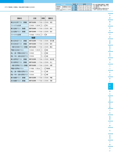 ▶同一名称の講座は設置校舎・設置期間・授業時間(時限)が異なっても同一内容です。▶担当講師は変更になる場合がありますので、あらかじめご了承ください。*「ライブ配信型」の授業は、見逃し配信でも受講いただけます。対面授業受講開始の4日前2024/2/11(日・祝)申込期限映像授業・オンライン授業時限時間1・2限3・4限5・6限9:00〜10:30・10:50〜12:2013:20〜14:50・15:10〜16:4017:00〜18:30・18:50〜20:20本郷麹町新宿池袋秋葉原自由が丘吉祥寺調布立川町田厚木藤沢横浜あざみ野金沢文庫大宮南浦和川越柏津田沼千葉水戸講座名日程時限講師名東北大化学テスト(映像)視聴可能期間:1/17(水)〜2/29(木)寺田ファイナル化学1/24(水)・1/25(木)5・6早川東大生物テスト(映像)視聴可能期間:1/17(水)〜2/29(木)向井北大生物テスト(映像)視聴可能期間:1/17(水)〜2/29(木)志水ファイナル生物1/26(金)・1/27(土)3・4岡地歴東大日本史テスト(映像)視聴可能期間:1/17(水)〜2/29(木)坂本(勝)京大日本史テスト(映像)視聴可能期間:1/17(水)〜2/29(木)宮本一橋大日本史テスト(映像)視聴可能期間:1/17(水)〜2/29(木)梶沼早慶大日本史テスト1/24(水)・1/25(木)3・4依田青山・立教・学習院大日本史テスト1/24(水)明治・中央・法政大日本史テスト1/25(木)5・6依田5・6太田東大世界史テスト(映像)視聴可能期間:1/17(水)〜2/29(木)坂本(新)京大世界史テスト(映像)視聴可能期間:1/17(水)〜2/29(木)井上一橋大世界史テスト(映像)視聴可能期間:1/17(水)〜2/29(木)矢野早慶大世界史テスト1/19(金)・1/20(土)1・2平尾(雅)青山・立教・学習院大世界史テスト1/24(水)明治・中央・法政大世界史テスト1/25(木)5・6大野5・6大野東大地理テスト(映像)視聴可能期間:1/17(水)〜2/29(木)伊藤京大地理テスト(映像)視聴可能期間:1/17(水)〜2/29(木)河野2ページ●2023年度/直前講習/東日本/藤沢/高3・卒生/パターン7043/2023_59_3_331_11_20230808105054.csv/0高校了時削除