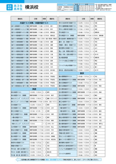 時限時間1・2限3・4限5・6限9:00〜10:30・10:50〜12:2013:20〜14:50・15:10〜16:4017:00〜18:30・18:50〜20:20▶同一名称の講座は設置校舎・設置期間・授業時間(時限)が異なっても同一内容です。▶担当講師は変更になる場合がありますので、あらかじめご了承ください。高3生高卒生直前講習対面授業受講開始の4日前2024/2/11(日・祝)申込期限映像授業・オンライン授業横浜校講座名日程時限講師名講座名日程時限講師名共通テスト対策/本番突破テスト共通テスト本番突破英語テスト(リーディング)映像)視聴可能期間:1/5(金)〜2/29(木)共通テスト本番突破英語テスト(リスニング)映像)視聴可能期間:1/5(金)〜2/29(木)清川安井早大(社会科学)英語テスト1/22(月)・1/23(火)5・6中島早大(国際教養)英語テスト1/19(金)・1/20(土)1・2伊吹早大(人間科学)英語テスト1/17(水)・1/18(木)1・2仲野共通テスト本番突破数学ⅠAテスト(映像)視聴可能期間:1/5(金)〜2/29(木)高梨(由)早大英語テスト1/26(金)・1/27(土)1・2髙橋(美)共通テスト本番突破数学ⅡBテスト(映像)視聴可能期間:1/5(金)〜2/29(木)高梨(由)早大英語テスト(映像)視聴可能期間:1/17(水)〜2/29(木)髙橋(慶)共通テスト本番突破国語テスト(映像)視聴可能期間:1/5(金)〜2/29(木)松藤・阿部(順)・伊藤(恭)慶大(総合政策・環境情報)英語テスト1/22(月)・1/23(火)3・4柴田(卓)共通テスト本番突破物理テスト(映像)視聴可能期間:1/5(金)〜2/29(木)共通テスト本番突破物理基礎テスト(映像)視聴可能期間:1/5(金)〜2/29(木)共通テスト本番突破化学テスト(映像)視聴可能期間:1/5(金)〜2/29(木)共通テスト本番突破化学基礎テスト(映像)視聴可能期間:1/5(金)〜2/29(木)共通テスト本番突破生物テスト(映像)視聴可能期間:1/5(金)〜2/29(木)共通テスト本番突破生物基礎テスト(映像)視聴可能期間:1/5(金)〜2/29(木)共通テスト本番突破地学テスト(映像)視聴可能期間:1/5(金)〜2/29(木)共通テスト本番突破地学基礎テスト(映像)視聴可能期間:1/5(金)〜2/29(木)共通テスト本番突破日本史Bテスト(映像)視聴可能期間:1/5(金)〜2/29(木)加藤加藤岡島岡島三浦三浦田島前田大内慶大(文)英語テスト1/24(水)・1/25(木)3・4丹羽早慶大(理工)英語テスト1/22(月)・1/23(火)5・6池田東京理科大英語テスト1/22(月)・1/23(火)1・2山口青山・立教・学習院大英語テスト1/22(月)・1/23(火)5・6大胡明治・中央・法政大英語テスト1/24(水)・1/25(木)3・4佐々木私大医進英語1/26(金)・1/27(土)3・4髙橋(保)ファイナル国公立大英語テスト1/22(月)・1/23(火)1・2押田ファイナル私大英語テスト1/19(金)・1/20(土)1・2幸長1/22(月)・1/23(火)5・6清川共通テスト本番突破世界史Bテスト(映像)視聴可能期間:1/5(金)〜2/29(木)坂本(新)英文法・語法完全攻略テスト1/24(水)・1/25(木)1・2佐々木共通テスト本番突破地理Bテスト(映像)視聴可能期間:1/5(金)〜2/29(木)中井数学共通テスト本番突破現代社会テスト(映像)視聴可能期間:1/5(金)〜2/29(木)平尾(則)東大理類数学テスト1/26(金)・1/27(土)3・4渋谷共通テスト本番突破政治・経済テスト(映像)視聴可能期間:1/5(金)〜2/29(木)平尾(則)東大理類数学テスト(映像)視聴可能期間:1/17(水)〜2/29(木)刈谷共通テスト本番突破倫理テスト(映像)視聴可能期間:1/5(金)〜2/29(木)平尾(則)東大文類数学テスト1/26(金)・1/27(土)3・4吉崎共通テスト本番突破倫理,政治・経済テスト(映像)視聴可能期間:1/5(金)〜2/29(木)平尾(則)東大文類数学テスト(映像)視聴可能期間:1/17(水)〜2/29(木)岡田英語京大理系数学テスト1/24(水)・1/25(木)1・2岡田東大英語テスト1/22(月)・1/23(火)3・4新野京大理系数学テスト(映像)視聴可能期間:1/17(水)〜2/29(木)西浦東大英語テスト(映像)視聴可能期間:1/17(水)〜2/29(木)高沢京大文系数学テスト1/24(水)・1/25(木)1・2横田東大リスニングインテンシブ1/29(月)・1/30(火)1・2遠藤・ロドリック京大文系数学テスト(映像)視聴可能期間:1/17(水)〜2/29(木)藤野東大リスニングインテンシブ(映像)視聴可能期間:1/17(水)〜2/29(木)久恒・マクフィ東工大数学テスト1/24(水)・1/25(木)3・4板谷京大英語テスト1/22(月)・1/23(火)1・2新野東工大数学テスト(映像)視聴可能期間:1/17(水)〜2/29(木)香坂京大英語テスト(映像)視聴可能期間:1/17(水)〜2/29(木)江本一橋大数学テスト1/24(水)・1/25(木)3・4横田東工大英語テスト1/31(水)・2/1(木)1・2仲野一橋大数学テスト(映像)視聴可能期間:1/17(水)〜2/29(木)飯田東工大英語テスト(映像)視聴可能期間:1/17(水)〜2/29(木)仲野北大理系数学テスト(映像)視聴可能期間:1/17(水)〜2/29(木)一橋大英語テスト1/29(月)・1/30(火)1・2新野東北大理系数学テスト(映像)視聴可能期間:1/17(水)〜2/29(木)一橋大英語テスト(映像)視聴可能期間:1/17(水)〜2/29(木)新野名大理系数学テスト(映像)視聴可能期間:1/17(水)〜2/29(木)福井木村小田一橋大リスニングインテンシブ1/23(火)1・2いずも・ガイ阪大理系数学テスト(映像)視聴可能期間:1/17(水)〜2/29(木)瀬戸山北大英語テスト(映像)視聴可能期間:1/17(水)〜2/29(木)松山九大理系数学テスト(映像)視聴可能期間:1/17(水)〜2/29(木)清水東北大英語テスト(映像)視聴可能期間:1/17(水)〜2/29(木)竹内横国大理系数学テスト1/24(水)・1/25(木)1・2須藤名大英語テスト