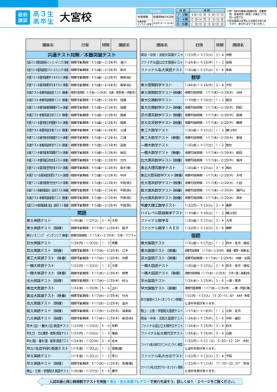 時限時間1・2限3・4限5・6限9:00〜10:30・10:50〜12:2013:20〜14:50・15:10〜16:4017:00〜18:30・18:50〜20:20▶同一名称の講座は設置校舎・設置期間・授業時間(時限)が異なっても同一内容です。▶担当講師は変更になる場合がありますので、あらかじめご了承ください。高3生高卒生直前講習対面授業受講開始の4日前2024/2/11(日・祝)申込期限映像授業・オンライン授業大宮校講座名日程時限講師名講座名日程時限講師名共通テスト対策/本番突破テスト共通テスト本番突破英語テスト(リーディング)映像)視聴可能期間:1/5(金)〜2/29(木)共通テスト本番突破英語テスト(リスニング)映像)視聴可能期間:1/5(金)〜2/29(木)清川安井共通テスト本番突破数学ⅠAテスト(映像)視聴可能期間:1/5(金)〜2/29(木)高梨(由)明治・中央・法政大英語テスト1/22(月)・1/23(火)3・4仲野ファイナル国公立大英語テスト1/24(水)・1/25(木)1・2岩間ファイナル私大英語テスト1/26(金)・1/27(土)5・6幸長数学共通テスト本番突破数学ⅡBテスト(映像)視聴可能期間:1/5(金)〜2/29(木)高梨(由)東大理類数学テスト1/24(水)・1/25(木)3・4渋谷共通テスト本番突破国語テスト(映像)視聴可能期間:1/5(金)〜2/29(木)松藤・阿部(順)・伊藤(恭)東大理類数学テスト(映像)視聴可能期間:1/17(水)〜2/29(木)刈谷共通テスト本番突破物理テスト(映像)視聴可能期間:1/5(金)〜2/29(木)共通テスト本番突破物理基礎テスト(映像)視聴可能期間:1/5(金)〜2/29(木)共通テスト本番突破化学テスト(映像)視聴可能期間:1/5(金)〜2/29(木)共通テスト本番突破化学基礎テスト(映像)視聴可能期間:1/5(金)〜2/29(木)共通テスト本番突破生物テスト(映像)視聴可能期間:1/5(金)〜2/29(木)共通テスト本番突破生物基礎テスト(映像)視聴可能期間:1/5(金)〜2/29(木)共通テスト本番突破地学テスト(映像)視聴可能期間:1/5(金)〜2/29(木)共通テスト本番突破地学基礎テスト(映像)視聴可能期間:1/5(金)〜2/29(木)共通テスト本番突破日本史Bテスト(映像)視聴可能期間:1/5(金)〜2/29(木)加藤加藤岡島岡島三浦三浦田島前田大内東大文類数学テスト1/19(金)・1/20(土)1・2飯田東大文類数学テスト(映像)視聴可能期間:1/17(水)〜2/29(木)京大理系数学テスト(映像)視聴可能期間:1/17(水)〜2/29(木)京大文系数学テスト(映像)視聴可能期間:1/17(水)〜2/29(木)岡田西浦藤野東工大数学テスト1/26(金)・1/27(土)1・2口(哲)東工大数学テスト(映像)視聴可能期間:1/17(水)〜2/29(木)香坂一橋大数学テスト1/26(金)・1/27(土)1・2尾台一橋大数学テスト(映像)視聴可能期間:1/17(水)〜2/29(木)飯田北大理系数学テスト(映像)視聴可能期間:1/17(水)〜2/29(木)福井共通テスト本番突破世界史Bテスト(映像)視聴可能期間:1/5(金)〜2/29(木)坂本(新)東北大理系数学テスト1/26(金)・1/27(土)3・4尾台共通テスト本番突破地理Bテスト(映像)視聴可能期間:1/5(金)〜2/29(木)中井東北大理系数学テスト(映像)視聴可能期間:1/17(水)〜2/29(木)共通テスト本番突破現代社会テスト(映像)視聴可能期間:1/5(金)〜2/29(木)平尾(則)名大理系数学テスト(映像)視聴可能期間:1/17(水)〜2/29(木)木村小田共通テスト本番突破政治・経済テスト(映像)視聴可能期間:1/5(金)〜2/29(木)平尾(則)阪大理系数学テスト(映像)視聴可能期間:1/17(水)〜2/29(木)瀬戸山共通テスト本番突破倫理テスト(映像)視聴可能期間:1/5(金)〜2/29(木)平尾(則)九大理系数学テスト(映像)視聴可能期間:1/17(水)〜2/29(木)清水共通テスト本番突破倫理,政治・経済テスト(映像)視聴可能期間:1/5(金)〜2/29(木)平尾(則)早慶大理工数学テスト1/22(月)・1/23(火)3・4秦野英語ハイレベル医進数学テスト1/19(金)・1/20(土)1・2口(哲)東大英語テスト1/26(金)・1/27(土)3・4久恒ファイナル数学Ⅲ1/26(金)・1/27(土)3・4大澤東大英語テスト(映像)視聴可能期間:1/17(水)〜2/29(木)高沢ファイナル数学ⅠAⅡB1/22(月)・1/23(火)5・6秦野東大リスニングインテンシブ(映像)視聴可能期間:1/17(水)〜2/29(木)久恒・マクフィ国語京大英語テスト1/29(月)・1/30(火)1・2明慶東大国語テスト1/26(金)・1/27(土)1・2鈴木・佐河・植松京大英語テスト(映像)視聴可能期間:1/17(水)〜2/29(木)江本東大国語テスト(映像)視聴可能期間:1/17(水)〜2/29(木)斎藤・藤澤・髙橋(佳)東工大英語テスト(映像)視聴可能期間:1/17(水)〜2/29(木)仲野京大国語テスト(映像)視聴可能期間:1/17(水)〜2/29(木)中崎・松尾一橋大英語テスト1/22(月)・1/23(火)1・2川原一橋大国語テスト1/26(金)・1/27(土)3・4鈴木・佐河・植松一橋大英語テスト(映像)視聴可能期間:1/17(水)〜2/29(木)新野一橋大国語テスト(映像)視聴可能期間:1/17(水)〜2/29(木)三河・園・髙橋(佳)北大英語テスト(映像)視聴可能期間:1/17(水)〜2/29(木)松山早大国語テスト1/24(水)・1/25(木)5・6一瀬・黒須東北大英語テスト1/24(水)・1/25(木)5・6山川早大国語テスト(映像)視聴可能期間:1/17(水)〜2/29(木)一瀬・阿部(順)東北大英語テスト(映像)視聴可能期間:1/17(水)〜2/29(木)竹内名大英語テスト(映像)視聴可能期間:1/17(水)〜2/29(木)金井早大国語テスト(オンライン授業)1/22(月)・1/23(火)13:20〜16:40*木村・隼坂!途中休憩があります。阪大英語テスト(映像)九大英語テスト(映像)視聴可能期間:1/17(水)〜2/29(木)胡摩﨑青山・立