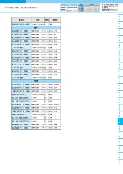 ▶同一名称の講座は設置校舎・設置期間・授業時間(時限)が異なっても同一内容です。▶担当講師は変更になる場合がありますので、あらかじめご了承ください。*「ライブ配信型」の授業は、見逃し配信でも受講いただけます。対面授業受講開始の4日前2024/2/11(日・祝)申込期限映像授業・オンライン授業時限時間1・2限3・4限5・6限9:00〜10:30・10:50〜12:2013:20〜14:50・15:10〜16:4017:00〜18:30・18:50〜20:20本郷麹町新宿池袋秋葉原自由が丘吉祥寺調布立川町田厚木藤沢横浜あざみ野金沢文庫大宮南浦和川越柏津田沼千葉水戸講座名日程時限講師名重要古語・語法完全攻略1/19(金)・1/20(土)1・2黒須理科東大物理テスト(映像)視聴可能期間:1/17(水)〜2/29(木)小野京大物理テスト(映像)視聴可能期間:1/17(水)〜2/29(木)乾東工大物理テスト(映像)視聴可能期間:1/17(水)〜2/29(木)田辺北大物理テスト(映像)視聴可能期間:1/17(水)〜2/29(木)島村東北大物理テスト(映像)視聴可能期間:1/17(水)〜2/29(木)渡部ファイナル物理1/22(月)・1/23(火)1・2宇都東大化学テスト(映像)視聴可能期間:1/17(水)〜2/29(木)寺田京大化学テスト(映像)視聴可能期間:1/17(水)〜2/29(木)大西東工大化学テスト(映像)視聴可能期間:1/17(水)〜2/29(木)安達北大化学テスト(映像)視聴可能期間:1/17(水)〜2/29(木)高田東北大化学テスト(映像)視聴可能期間:1/17(水)〜2/29(木)寺田ファイナル化学1/24(水)・1/25(木)5・6岡島東大生物テスト(映像)視聴可能期間:1/17(水)〜2/29(木)向井北大生物テスト(映像)視聴可能期間:1/17(水)〜2/29(木)志水ファイナル生物1/24(水)・1/25(木)3・4染谷地歴東大日本史テスト(映像)視聴可能期間:1/17(水)〜2/29(木)坂本(勝)京大日本史テスト(映像)視聴可能期間:1/17(水)〜2/29(木)宮本一橋大日本史テスト(映像)視聴可能期間:1/17(水)〜2/29(木)梶沼早慶大日本史テスト1/22(月)・1/23(火)3・4依田青山・立教・学習院大日本史テスト1/22(月)明治・中央・法政大日本史テスト1/23(火)5・6依田5・6依田東大世界史テスト(映像)視聴可能期間:1/17(水)〜2/29(木)坂本(新)京大世界史テスト(映像)視聴可能期間:1/17(水)〜2/29(木)井上一橋大世界史テスト(映像)視聴可能期間:1/17(水)〜2/29(木)矢野早慶大世界史テスト1/22(月)・1/23(火)3・4小嶋青山・立教・学習院大世界史テスト1/22(月)明治・中央・法政大世界史テスト1/23(火)5・6小嶋5・6小嶋東大地理テスト(映像)視聴可能期間:1/17(水)〜2/29(木)伊藤京大地理テスト(映像)視聴可能期間:1/17(水)〜2/29(木)河野2ページ●2023年度/直前講習/東日本/大宮/高3・卒生/パターン7043/2023_59_3_324_11_20230808105054.csv/0高校了時削除