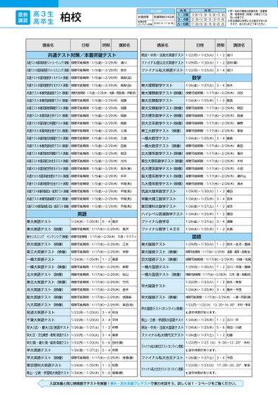 時限時間1・2限3・4限5・6限9:00〜10:30・10:50〜12:2013:20〜14:50・15:10〜16:4017:00〜18:30・18:50〜20:20▶同一名称の講座は設置校舎・設置期間・授業時間(時限)が異なっても同一内容です。▶担当講師は変更になる場合がありますので、あらかじめご了承ください。高3生高卒生直前講習対面授業受講開始の4日前2024/2/11(日・祝)申込期限映像授業・オンライン授業柏校講座名日程時限講師名講座名日程時限講師名共通テスト対策/本番突破テスト共通テスト本番突破英語テスト(リーディング)映像)視聴可能期間:1/5(金)〜2/29(木)共通テスト本番突破英語テスト(リスニング)映像)視聴可能期間:1/5(金)〜2/29(木)清川安井共通テスト本番突破数学ⅠAテスト(映像)視聴可能期間:1/5(金)〜2/29(木)高梨(由)明治・中央・法政大英語テスト1/22(月)・1/23(火)1・2成川ファイナル国公立大英語テスト1/29(月)・1/30(火)1・2田村(喜)ファイナル私大英語テスト1/22(月)・1/23(火)3・4成川数学共通テスト本番突破数学ⅡBテスト(映像)視聴可能期間:1/5(金)〜2/29(木)高梨(由)東大理類数学テスト1/26(金)・1/27(土)3・4鈴木共通テスト本番突破国語テスト(映像)視聴可能期間:1/5(金)〜2/29(木)松藤・阿部(順)・伊藤(恭)東大理類数学テスト(映像)視聴可能期間:1/17(水)〜2/29(木)刈谷共通テスト本番突破物理テスト(映像)視聴可能期間:1/5(金)〜2/29(木)共通テスト本番突破物理基礎テスト(映像)視聴可能期間:1/5(金)〜2/29(木)共通テスト本番突破化学テスト(映像)視聴可能期間:1/5(金)〜2/29(木)共通テスト本番突破化学基礎テスト(映像)視聴可能期間:1/5(金)〜2/29(木)共通テスト本番突破生物テスト(映像)視聴可能期間:1/5(金)〜2/29(木)共通テスト本番突破生物基礎テスト(映像)視聴可能期間:1/5(金)〜2/29(木)共通テスト本番突破地学テスト(映像)視聴可能期間:1/5(金)〜2/29(木)共通テスト本番突破地学基礎テスト(映像)視聴可能期間:1/5(金)〜2/29(木)共通テスト本番突破日本史Bテスト(映像)視聴可能期間:1/5(金)〜2/29(木)加藤加藤岡島岡島三浦三浦田島前田大内東大文類数学テスト1/24(水)・1/25(木)1・2飯島東大文類数学テスト(映像)視聴可能期間:1/17(水)〜2/29(木)京大理系数学テスト(映像)視聴可能期間:1/17(水)〜2/29(木)京大文系数学テスト(映像)視聴可能期間:1/17(水)〜2/29(木)岡田西浦藤野東工大数学テスト(映像)視聴可能期間:1/17(水)〜2/29(木)香坂一橋大数学テスト1/24(水)・1/25(木)3・4飯島一橋大数学テスト(映像)視聴可能期間:1/17(水)〜2/29(木)飯田北大理系数学テスト(映像)視聴可能期間:1/17(水)〜2/29(木)東北大理系数学テスト(映像)視聴可能期間:1/17(水)〜2/29(木)福井木村小田共通テスト本番突破世界史Bテスト(映像)視聴可能期間:1/5(金)〜2/29(木)坂本(新)名大理系数学テスト(映像)視聴可能期間:1/17(水)〜2/29(木)共通テスト本番突破地理Bテスト(映像)視聴可能期間:1/5(金)〜2/29(木)中井阪大理系数学テスト(映像)視聴可能期間:1/17(水)〜2/29(木)瀬戸山共通テスト本番突破現代社会テスト(映像)視聴可能期間:1/5(金)〜2/29(木)平尾(則)九大理系数学テスト(映像)視聴可能期間:1/17(水)〜2/29(木)清水共通テスト本番突破政治・経済テスト(映像)視聴可能期間:1/5(金)〜2/29(木)平尾(則)筑波大理系数学テスト1/29(月)・1/30(火)1・2郷田共通テスト本番突破倫理テスト(映像)視聴可能期間:1/5(金)〜2/29(木)平尾(則)早慶大理工数学テスト1/24(水)・1/25(木)3・4宮本共通テスト本番突破倫理,政治・経済テスト(映像)視聴可能期間:1/5(金)〜2/29(木)平尾(則)東京理科大数学テスト1/26(金)・1/27(土)1・2成合英語ハイレベル医進数学テスト1/24(水)・1/25(木)1・2郷田東大英語テスト1/24(水)・1/25(木)3・4高沢ファイナル数学Ⅲ1/26(金)・1/27(土)3・4遠藤東大英語テスト(映像)視聴可能期間:1/17(水)〜2/29(木)高沢ファイナル数学ⅠAⅡB1/24(水)・1/25(木)1・2永島東大リスニングインテンシブ(映像)視聴可能期間:1/17(水)〜2/29(木)久恒・マクフィ国語京大英語テスト(映像)視聴可能期間:1/17(水)〜2/29(木)江本東大国語テスト1/29(月)・1/30(火)1・2鈴木・佐河・豊崎東工大英語テスト(映像)視聴可能期間:1/17(水)〜2/29(木)仲野東大国語テスト(映像)視聴可能期間:1/17(水)〜2/29(木)斎藤・藤澤・髙橋(佳)一橋大英語テスト1/24(水)・1/25(木)1・2篠原京大国語テスト(映像)視聴可能期間:1/17(水)〜2/29(木)中崎・松尾一橋大英語テスト(映像)視聴可能期間:1/17(水)〜2/29(木)新野一橋大国語テスト1/29(月)・1/30(火)1・2立川・中西・豊崎北大英語テスト(映像)視聴可能期間:1/17(水)〜2/29(木)松山一橋大国語テスト(映像)視聴可能期間:1/17(水)〜2/29(木)三河・園・髙橋(佳)東北大英語テスト(映像)視聴可能期間:1/17(水)〜2/29(木)竹内名大英語テスト(映像)視聴可能期間:1/17(水)〜2/29(木)金井早大国語テスト1/22(月)・1/23(火)1・2鈴木・隼坂1/24(水)・1/25(木)3・4亀井・今西阪大英語テスト(映像)九大英語テスト(映像)筑波大英語テスト千葉大英語テスト視聴可能期間:1/17(水)〜2/29(木)胡摩﨑早大国語テスト(映像)視聴可能期間:1/17(水)〜2/29(木)一瀬・阿部(順)視聴可能期間:1/17(水)〜2/29(木)柴田(祐)1/22(月)・1/23(火)3・4秋谷1/22(月)・1/23(火)3・4平林早大国語テスト(オンライン