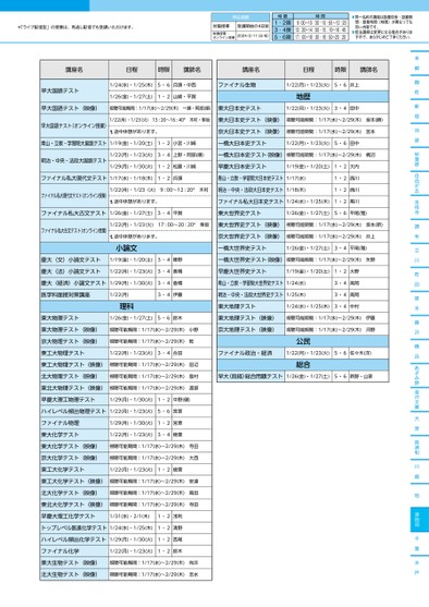 ▶同一名称の講座は設置校舎・設置期間・授業時間(時限)が異なっても同一内容です。▶担当講師は変更になる場合がありますので、あらかじめご了承ください。*「ライブ配信型」の授業は、見逃し配信でも受講いただけます。対面授業受講開始の4日前2024/2/11(日・祝)申込期限映像授業・オンライン授業時限時間1・2限3・4限5・6限9:00〜10:30・10:50〜12:2013:20〜14:50・15:10〜16:4017:00〜18:30・18:50〜20:20本郷麹町新宿池袋秋葉原自由が丘吉祥寺調布立川町田厚木藤沢横浜あざみ野金沢文庫大宮南浦和川越柏津田沼千葉水戸講座名日程時限講師名講座名日程時限講師名早大国語テスト1/24(水)・1/25(木)5・6兵頭・中西ファイナル生物1/22(月)・1/23(火)5・6井上1/26(金)・1/27(土)1・2山崎・平賀地歴早大国語テスト(映像)視聴可能期間:1/17(水)〜2/29(木)一瀬・阿部(順)東大日本史テスト1/22(月)・1/23(火)3・4田中早大国語テスト(オンライン授業)1/22(月)・1/23火)13:20〜16:40*木村・隼坂東大日本史テスト(映像)視聴可能期間:1/17(水)〜2/29(木)坂本(勝)!途中休憩があります。京大日本史テスト(映像)視聴可能期間:1/17(水)〜2/29(木)宮本青山・立教・学習院大国語テスト1/19(金)・1/20(土)1・2小宮・川崎一橋大日本史テスト1/22(月)・1/23(火)5・6田中明治・中央・法政大国語テスト1/22(月)・1/23(火)3・4上野・阿部(順)一橋大日本史テスト(映像)視聴可能期間:1/17(水)〜2/29(木)梶沼1/29(月)・1/30(火)1・2松藤・川崎早慶大日本史テスト1/19(金)・1/20(土)1・2大内ファイナル私大現代文テスト1/17(水)・1/18(木)1・2兵頭青山・立教・学習院大日本史テスト1/17(水)1・2西川1・2西川ファイナル私大現代文テスト(オンライン授業)1/22(月)・1/23(火)9:00〜12:20*木村明治・中央・法政大日本史テスト1/18(木)!途中休憩があります。ファイナル私大日本史テスト1/24(水)・1/25(木)1・2黒川ファイナル私大古文テスト1/26(金)・1/27(土)3・4平賀東大世界史テスト1/26(金)・1/27(土)5・6平尾(雅)ファイナル私大古文テスト(オンライン授業)1/22(月)・1/23(火)17:00〜20:20*隼坂東大世界史テスト(映像)視聴可能期間:1/17(水)〜2/29(木)坂本(新)!途中休憩があります。小論文京大世界史テスト(映像)視聴可能期間:1/17(水)〜2/29(木)井上一橋大世界史テスト1/26(金)・1/27(土)3・4平尾(雅)慶大(文)小論文テスト1/19(金)・1/20(土)3・4陣野一橋大世界史テスト(映像)視聴可能期間:1/17(水)〜2/29(木)矢野慶大(法)小論文テスト1/22(月)・1/23(火)3・4倉橋早慶大世界史テスト1/19(金)・1/20(土)1・2大野慶大(経済)小論文テスト1/29(月)・1/30(火)3・4倉橋医学科面接対策講座1/22(月)3・4伊藤理科青山・立教・学習院大世界史テスト1/24(水)明治・中央・法政大世界史テスト1/25(木)3・4髙岡3・4髙岡東大地理テスト1/24(水)・1/25(木)3・4中村東大物理テスト1/26(金)・1/27(土)5・6鈴木東大地理テスト(映像)視聴可能期間:1/17(水)〜2/29(木)伊藤東大物理テスト(映像)視聴可能期間:1/17(水)〜2/29(木)小野京大地理テスト(映像)視聴可能期間:1/17(水)〜2/29(木)河野京大物理テスト(映像)視聴可能期間:1/17(水)〜2/29(木)乾公民東工大物理テスト1/22(月)・1/23(火)3・4合田ファイナル政治・経済1/22(月)・1/23(火)5・6佐々木(洋)東工大物理テスト(映像)視聴可能期間:1/17(水)〜2/29(木)田辺総合北大物理テスト(映像)視聴可能期間:1/17(水)〜2/29(木)島村早大(政経)総合問題テスト1/26(金)・1/27(土)5・6新野・山家東北大物理テスト(映像)視聴可能期間:1/17(水)〜2/29(木)渡部早慶大理工物理テスト1/29(月)・1/30(火)1・2中野(健)ハイレベル頻出物理テスト1/22(月)・1/23(火)5・6宮原ファイナル物理東大化学テスト1/29(月)・1/30(火)1・2宮原1/22(月)・1/23(火)3・4樹葉東大化学テスト(映像)視聴可能期間:1/17(水)〜2/29(木)寺田京大化学テスト(映像)視聴可能期間:1/17(水)〜2/29(木)大西東工大化学テスト1/22(月)・1/23(火)1・2樹葉東工大化学テスト(映像)視聴可能期間:1/17(水)〜2/29(木)安達北大化学テスト(映像)視聴可能期間:1/17(水)〜2/29(木)高田東北大化学テスト(映像)視聴可能期間:1/17(水)〜2/29(木)寺田早慶大理工化学テスト1/31(水)・2/1(木)1・2浅利トップレベル医進化学テスト1/24(水)・1/25(木)1・2清野ハイレベル頻出化学テスト1/29(月)・1/30(火)1・2西尾ファイナル化学1/22(月)・1/23(火)1・2鈴木東大生物テスト(映像)視聴可能期間:1/17(水)〜2/29(木)向井北大生物テスト(映像)視聴可能期間:1/17(水)〜2/29(木)志水2ページ●2023年度/直前講習/東日本/津田沼/高3・卒生/パターン7043/2023_59_3_327_11_20230808105054.csv校了時削除