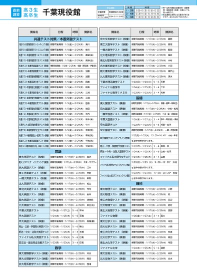 時限時間1・2限3・4限5・6限9:00〜10:30・10:50〜12:2013:20〜14:50・15:10〜16:4017:00〜18:30・18:50〜20:20▶同一名称の講座は設置校舎・設置期間・授業時間(時限)が異なっても同一内容です。▶担当講師は変更になる場合がありますので、あらかじめご了承ください。高3生高卒生直前講習対面授業受講開始の4日前2024/2/11(日・祝)申込期限映像授業・オンライン授業千葉現役館講座名日程時限講師名講座名日程時限講師名共通テスト対策/本番突破テスト共通テスト本番突破英語テスト(リーディング)映像)視聴可能期間:1/5(金)〜2/29(木)共通テスト本番突破英語テスト(リスニング)映像)視聴可能期間:1/5(金)〜2/29(木)清川安井京大文系数学テスト(映像)視聴可能期間:1/17(水)〜2/29(木)藤野東工大数学テスト(映像)視聴可能期間:1/17(水)〜2/29(木)香坂一橋大数学テスト(映像)視聴可能期間:1/17(水)〜2/29(木)飯田共通テスト本番突破数学ⅠAテスト(映像)視聴可能期間:1/5(金)〜2/29(木)高梨(由)北大理系数学テスト(映像)視聴可能期間:1/17(水)〜2/29(木)共通テスト本番突破数学ⅡBテスト(映像)視聴可能期間:1/5(金)〜2/29(木)高梨(由)東北大理系数学テスト(映像)視聴可能期間:1/17(水)〜2/29(木)共通テスト本番突破国語テスト(映像)視聴可能期間:1/5(金)〜2/29(木)松藤・阿部(順)・伊藤(恭)名大理系数学テスト(映像)視聴可能期間:1/17(水)〜2/29(木)福井木村小田共通テスト本番突破物理テスト(映像)視聴可能期間:1/5(金)〜2/29(木)共通テスト本番突破物理基礎テスト(映像)視聴可能期間:1/5(金)〜2/29(木)共通テスト本番突破化学テスト(映像)視聴可能期間:1/5(金)〜2/29(木)共通テスト本番突破化学基礎テスト(映像)視聴可能期間:1/5(金)〜2/29(木)共通テスト本番突破生物テスト(映像)視聴可能期間:1/5(金)〜2/29(木)共通テスト本番突破生物基礎テスト(映像)視聴可能期間:1/5(金)〜2/29(木)共通テスト本番突破地学テスト(映像)視聴可能期間:1/5(金)〜2/29(木)共通テスト本番突破地学基礎テスト(映像)視聴可能期間:1/5(金)〜2/29(木)共通テスト本番突破日本史Bテスト(映像)視聴可能期間:1/5(金)〜2/29(木)加藤加藤岡島岡島三浦三浦田島前田大内阪大理系数学テスト(映像)視聴可能期間:1/17(水)〜2/29(木)瀬戸山九大理系数学テスト(映像)視聴可能期間:1/17(水)〜2/29(木)清水千葉大理系数学テスト1/22(月)・1/23(火)5・6天野ファイナル数学Ⅲ1/24(水)・1/25(木)3・4三木ファイナル数学ⅠAⅡB1/22(月)・1/23(火)3・4天野国語東大国語テスト(映像)京大国語テスト(映像)視聴可能期間:1/17(水)〜2/29(木)斎藤・藤澤・髙橋(佳)視聴可能期間:1/17(水)〜2/29(木)中崎・松尾一橋大国語テスト(映像)視聴可能期間:1/17(水)〜2/29(木)三河・園・髙橋(佳)共通テスト本番突破世界史Bテスト(映像)視聴可能期間:1/5(金)〜2/29(木)坂本(新)千葉大国語テスト1/26(金)・1/27(土)3・4野中・阿部(誠)・桑島共通テスト本番突破地理Bテスト(映像)視聴可能期間:1/5(金)〜2/29(木)中井早大国語テスト1/22(月)・1/23(火)5・6兵頭・佐河共通テスト本番突破現代社会テスト(映像)視聴可能期間:1/5(金)〜2/29(木)平尾(則)早大国語テスト(映像)視聴可能期間:1/17(水)〜2/29(木)一瀬・阿部(順)共通テスト本番突破政治・経済テスト(映像)視聴可能期間:1/5(金)〜2/29(木)平尾(則)共通テスト本番突破倫理テスト(映像)視聴可能期間:1/5(金)〜2/29(木)平尾(則)早大国語テスト(オンライン授業)1/22(月)・1/23(火)13:20〜16:40*木村・隼坂!途中休憩があります。共通テスト本番突破倫理,政治・経済テスト(映像)視聴可能期間:1/5(金)〜2/29(木)平尾(則)青山・立教・学習院大国語テスト1/22(月)・1/23(火)3・4兵頭・中東大英語テスト(映像)視聴可能期間:1/17(水)〜2/29(木)高沢ファイナル私大現代文テスト1/24(水)・1/25(木)3・4山崎英語明治・中央・法政大国語テスト1/24(水)・1/25(木)5・6山崎・佐河東大リスニングインテンシブ(映像)視聴可能期間:1/17(水)〜2/29(木)久恒・マクフィ京大英語テスト(映像)視聴可能期間:1/17(水)〜2/29(木)江本東工大英語テスト(映像)視聴可能期間:1/17(水)〜2/29(木)仲野一橋大英語テスト(映像)視聴可能期間:1/17(水)〜2/29(木)新野北大英語テスト(映像)視聴可能期間:1/17(水)〜2/29(木)松山ファイナル私大現代文テスト(オンライン授業)ファイナル私大古文テスト(オンライン授業)1/22(月)・1/23(火)9:00〜12:20*木村!途中休憩があります。1/22(月)・1/23(火)17:00〜20:20*隼坂!途中休憩があります。理科東北大英語テスト(映像)視聴可能期間:1/17(水)〜2/29(木)竹内東大物理テスト(映像)視聴可能期間:1/17(水)〜2/29(木)小野名大英語テスト(映像)視聴可能期間:1/17(水)〜2/29(木)金井京大物理テスト(映像)視聴可能期間:1/17(水)〜2/29(木)乾阪大英語テスト(映像)九大英語テスト(映像)千葉大英語テスト早大英語テスト視聴可能期間:1/17(水)〜2/29(木)胡摩﨑東工大物理テスト(映像)視聴可能期間:1/17(水)〜2/29(木)田辺視聴可能期間:1/17(水)〜2/29(木)柴田(祐)北大物理テスト(映像)視聴可能期間:1/17(水)〜2/29(木)島村1/26(金)・1/27(土)5・6平林1/24(水)・1/25(木)5・6石橋東北大物理テスト(映像)視聴可能期間:1/17(水)〜2/29(木)渡部ファイナル物理1/26(金)・1/27(土)3・4酒井早大英語テスト
