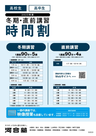 大阪校/東大・京大・医進館/上本町校/天王寺校/京都校/神戸三宮校豊中教室/高槻教室/堺東教室/岸和田教室/三田教室/西大寺教室/八木教室高校生高卒生冬期・直前講習2023年度1講座90分×5講◎設置期間(ターム)※形式(授業分数または講数)の異なる講座もあります。※冬期講習と直前講習の1限〜4限の授業時間が異なります。※形式(授業分数または講数)の異なる講座もあります。冬期講習1講座90分×4講直前講習◎設置期間日程1/7(日)〜3/14(木)53033ターム日程1ターム短期ターム①2ターム短期ターム②3ターム短期ターム③4ターム12/11(月)〜12/15(金)12/16(土)・17(日)12/18(月)〜12/22(金)12/23(土)・24(日)12/25(月)〜12/29(金)12/30(土)・31(日)1/2(火)〜1/6(土)講座内容など詳細はWebサイトへ◎授業時間(時限)時限時間1限2限3限4限5限6限9:30〜11:0011:20〜12:5013:40〜15:1015:30〜17:0017:20〜18:5019:10〜20:40◎授業時間(時限)時限時間1限2限3限4限5限6限9:10〜10:4011:00〜12:3013:10〜14:4015:00〜16:3017:20〜18:5019:10〜20:40一部の講座では、映像授業も設置しています。冬期講習:2023/12/11(月)〜2024/2/29(木)直前講習:2024/1/17(水)〜2024/2/29(木)視聴可能期間2023年度冬期・直前講習時間割高校生・高卒生
