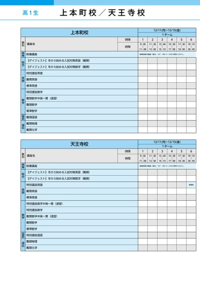 12/11(月)~12/15(金)121ターム34569:30〜11:0011:2013:4015:3017:2019:10〜〜〜〜〜12:5015:1017:0018:5020:40映像授業の講座一覧は、107・108ページをご参照ください。12/11(月)~12/15(金)121ターム34569:30〜11:0011:2013:4015:3017:2019:10〜〜〜〜〜12:5015:1017:0018:5020:40映像授業の講座一覧は、107・108ページをご参照ください。胡摩﨑時限時間時限時間上本町校講座名教科映像講座映像【ダイジェスト】冬から始める入試対策英語(難関)【ダイジェスト】冬から始める入試対策数学(難関)特別選抜英語難関英語標準英語特別選抜数学難関数学中高一貫(速習)難関数学標準数学難関国語難関物理難関化学総合英語数学国語理科天王寺校講座名教科映像講座映像【ダイジェスト】冬から始める入試対策英語(難関)【ダイジェスト】冬から始める入試対策数学(難関)特別選抜英語難関英語標準英語特別選抜数学中高一貫(速習)特別選抜数学難関数学中高一貫(速習)難関数学標準数学特別選抜国語難関物理難関化学総合英語数学国語理科上本町校/天王寺校●2023年度/冬期講習/近畿/上本町/高1生/パターン24352023_57_5_513_31_20230724111537.csv/1ページ校了時削除