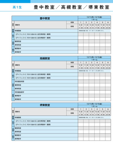 豊中教室/高槻教室/堺東教室12/11(月)~12/15(金)121ターム34569:30〜11:0011:2013:4015:3017:2019:10〜〜〜〜〜12:5015:1017:0018:5020:40映像授業の講座一覧は、107・108ページをご参照ください。12/11(月)~12/15(金)121ターム43569:30〜11:0011:2013:4015:3017:2019:10〜〜〜〜〜12:5015:1017:0018:5020:40映像授業の講座一覧は、107・108ページをご参照ください。12/11(月)~12/15(金)121ターム34569:30〜11:0011:2013:4015:3017:2019:1012:5015:1017:0018:5020:40〜〜〜〜〜映像授業の講座一覧は、107・108ページをご参照ください。時限時間時限時間時限時間豊中教室高槻教室【ダイジェスト】冬から始める入試対策英語(難関)【ダイジェスト】冬から始める入試対策数学(難関)難関英語標準英語難関数学標準数学総合英語数学講座名教科映像講座映像講座名教科映像講座映像【ダイジェスト】冬から始める入試対策英語(難関)【ダイジェスト】冬から始める入試対策数学(難関)特別選抜英語難関英語標準英語特別選抜数学難関数学標準数学総合英語数学堺東教室【ダイジェスト】冬から始める入試対策英語(難関)【ダイジェスト】冬から始める入試対策数学(難関)難関英語標準英語難関数学標準数学総合英語数学講座名教科映像講座映像●2023年度/冬期講習/近畿/豊中/高1生/パターン24352023_57_5_563_31_20230718120202.csv/1ページ校了時削除