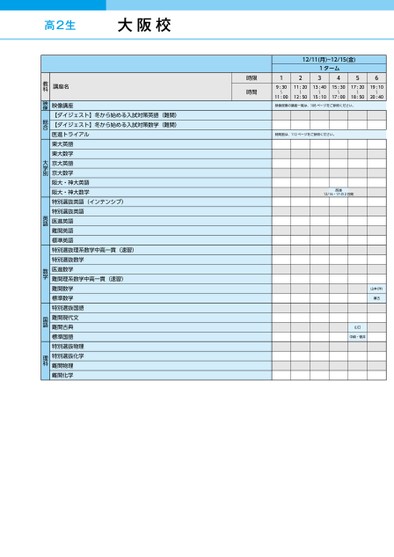 12/11(月)~12/15(金)121ターム34569:30〜11:0011:2013:4015:3017:2019:10〜〜12:5015:1017:0018:5020:40〜〜〜映像授業の講座一覧は、108ページをご参照ください。時間割は、112ページをご参照ください。西浦12/16・17の2日間山本(洋)瀬古山口中崎・菅井時限時間大阪校講座名映像講座【ダイジェスト】冬から始める入試対策英語(難関)【ダイジェスト】冬から始める入試対策数学(難関)医進トライアル東大英語東大数学京大英語京大数学阪大・神大英語阪大・神大数学特別選抜英語(インテンシブ)特別選抜英語医進英語難関英語標準英語特別選抜理系数学中高一貫(速習)特別選抜数学医進数学難関理系数学中高一貫(速習)難関数学標準数学特別選抜国語難関現代文難関古典標準国語特別選抜物理特別選抜化学難関物理難関化学教科映像総合大学別英語数学国語理科●2023年度/冬期講習/近畿/大阪/高2生/パターン24452023_57_5_511_32_20230723144811.csv/1ページ校了時削除