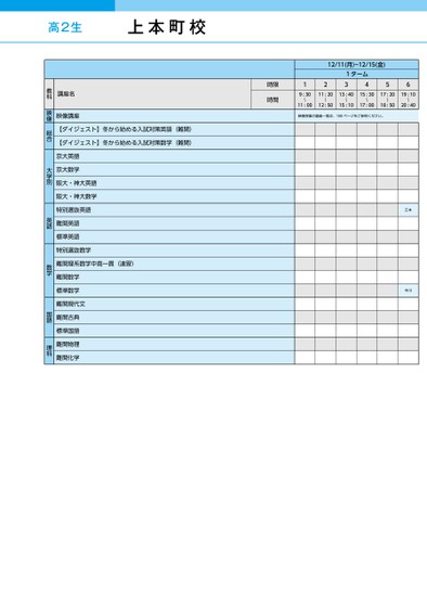 12/11(月)~12/15(金)121ターム34569:30〜11:0011:2013:4015:3017:2019:10〜〜12:5015:1017:0018:5020:40〜〜〜映像授業の講座一覧は、108ページをご参照ください。江本中川上本町校時限時間講座名教科映像講座映像【ダイジェスト】冬から始める入試対策英語(難関)【ダイジェスト】冬から始める入試対策数学(難関)京大英語京大数学阪大・神大英語阪大・神大数学特別選抜英語難関英語標準英語特別選抜数学難関理系数学中高一貫(速習)難関数学標準数学難関現代文難関古典標準国語難関物理難関化学総合大学別英語数学国語理科●2023年度/冬期講習/近畿/上本町/高2生/パターン24352023_57_5_513_32_20230803191725.csv/1ページ校了時削除