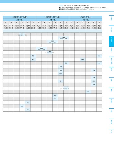 大阪校上本町校天王寺校京都校神戸三宮校豊中高槻堺東岸和田三田西大寺八木12/18(月)~12/22(金)122ターム34561212/25(月)~12/29(金)3ターム3456121/2(火)~1/6(土)4ターム34569:30〜11:0011:2013:4015:3017:2019:10〜〜〜〜〜12:5015:1017:0018:5020:409:30〜11:0011:2013:4015:3017:2019:1012:5015:1017:0018:5020:40〜〜〜〜〜9:30〜11:0011:2013:4015:3017:2019:10〜〜〜〜〜12:5015:1017:0018:5020:40西内12/23・24の2日間上高原12/30の1日完結胡摩﨑12/30の1日完結胡摩﨑12/30の1日完結上高原12/29・30の2日間原田香川法山木多中田山田上高原信岡胡摩﨑津留瀬尾藤田山本(洋)岸佐佐木・山本(ま)・畑江濵菅井吉田辻居小松岡内