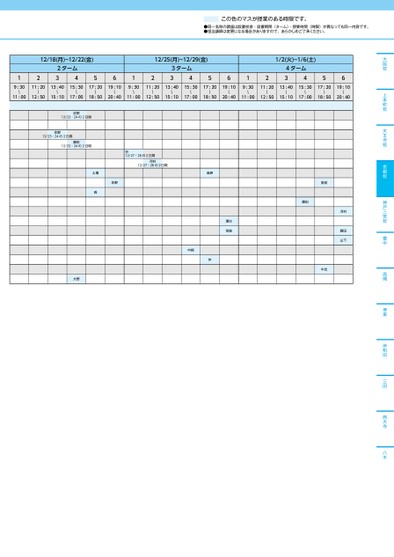 大阪校上本町校天王寺校京都校神戸三宮校豊中高槻堺東岸和田三田西大寺八木島原瀬古宮崎中崎仲藤田堂前中出河村藤田山下12/27・28の2日間2/27・28の2日間河村谷1佐野12/23・24の2日間佐野12/23・24の2日間藤田12/23・24の2日間土橋巽佐野大野12/18(月)~12/22(金)122ターム34561212/25(月)~12/29(金)3ターム3456121/2(火)~1/6(土)4ターム34569:30〜11:0011:2013:4015:3017:2019:10〜〜〜〜〜12:5015:1017:0018:5020:409:30〜11:0011:2013:4015:3017:2019:10〜〜〜〜〜12:5015:1017:0018:5020:409:30〜11:0011:2013:4015:3017:2019:10〜〜〜〜〜12:5015:1017:0018:5020:40
