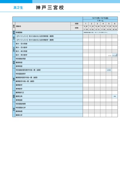 12/11(月)~12/15(金)121ターム34569:30〜11:0011:2013:4015:3017:2019:10〜〜12:5015:1017:0018:5020:40〜〜〜映像授業の講座一覧は、108ページをご参照ください。岸12/16・17の2日間山本(敏)伊賀神戸三宮校時限時間講座名教科映像講座映像【ダイジェスト】冬から始める入試対策英語(難関)【ダイジェスト】冬から始める入試対策数学(難関)東大・京大英語東大・京大数学阪大・神大英語阪大・神大数学特別選抜英語難関英語標準英語特別選抜理系数学中高一貫(速習)特別選抜数学難関理系数学中高一貫(速習)難関数学中高一貫(速習)難関数学標準数学難関現代文難関古典標準国語特別選抜物理特別選抜化学難関物理難関化学総合大学別英語数学国語理科●2023年度/冬期講習/近畿/神戸三宮/高2生/パターン24352023_57_5_514_32_20230720183035.csv/1ページ校了時削除