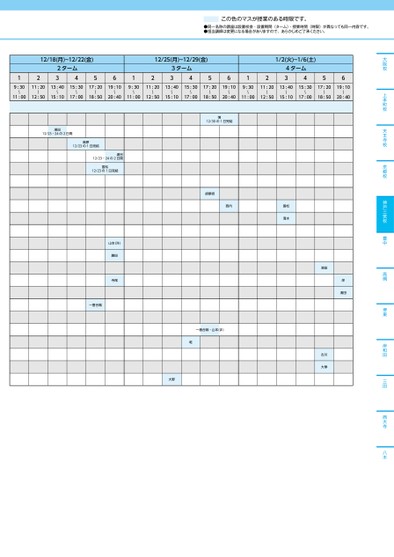 大阪校上本町校天王寺校京都校神戸三宮校豊中高槻堺東岸和田三田西大寺八木12/18(月)~12/22(金)122ターム34561212/25(月)~12/29(金)3ターム3456121/2(火)~1/6(土)4ターム34569:30〜11:0011:2013:4015:3017:2019:10〜〜〜〜〜12:5015:1017:0018:5020:409:30〜11:0011:2013:4015:3017:2019:1012:5015:1017:0018:5020:40〜〜〜〜〜9:30〜11:0011:2013:4015:3017:2019:10〜〜〜〜〜12:5015:1017:0018:5020:40湘田12/23・24の2日間島原12/23の1日完結涌谷12/23・24の2日間国松12/23の1日完結山本(洋)藤田寺尾一番合戦慎12/30の1日完結胡摩﨑西内国松清水岸湘田湘田古川大學一番合戦・山本(ま)乾大野