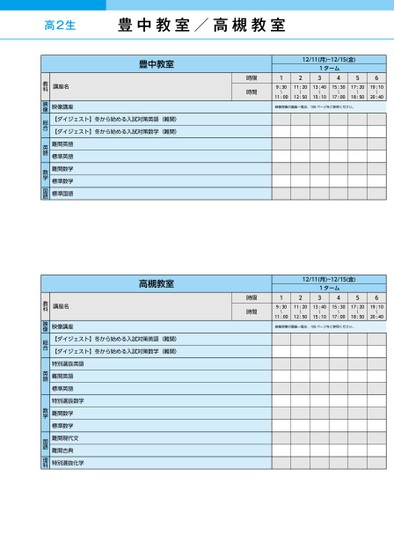 12/11(月)~12/15(金)121ターム34569:30〜11:0011:2013:4015:3017:2019:10〜〜〜〜〜12:5015:1017:0018:5020:40映像授業の講座一覧は、108ページをご参照ください。12/11(月)~12/15(金)121ターム34569:30〜11:0011:2013:4015:3017:2019:10〜〜〜〜〜12:5015:1017:0018:5020:40映像授業の講座一覧は、108ページをご参照ください。時限時間時限時間豊中教室講座名教科映像講座映像【ダイジェスト】冬から始める入試対策英語(難関)【ダイジェスト】冬から始める入試対策数学(難関)難関英語標準英語難関数学標準数学標準国語総合英語数学国語高槻教室講座名教科映像講座映像【ダイジェスト】冬から始める入試対策英語(難関)【ダイジェスト】冬から始める入試対策数学(難関)特別選抜英語難関英語標準英語特別選抜数学難関数学標準数学難関現代文難関古典特別選抜化学総合英語数学国語理科豊中教室/高槻教室●2023年度/冬期講習/近畿/豊中/高2生/パターン24352023_57_5_563_32_20230718120202.csv/1ページ校了時削除