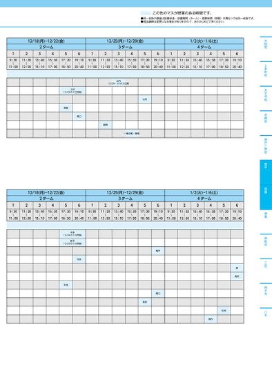 大阪校上本町校天王寺校京都校神戸三宮校豊中高槻堺東岸和田三田西大寺八木12/18(月)~12/22(金)122ターム34561212/25(月)~12/29(金)3ターム3456121/2(火)~1/6(土)4ターム34569:30〜11:0011:2013:4015:3017:2019:10〜〜〜〜〜12:5015:1017:0018:5020:409:30〜11:0011:2013:4015:3017:2019:10〜〜〜〜〜12:5015:1017:0018:5020:409:30〜11:0011:2013:4015:3017:2019:10〜〜〜〜〜12:5015:1017:0018:5020:40上村12/23の1日完結津留関口山内12/28・29の2日間山内数野一番合戦・瀬島12/18(月)~12/22(金)122ターム34561212/25(月)~12/29(金)3ターム3456121/2(火)~1/6(土)4ターム34569:30〜11:0011:2013:4015:3017:2019:10〜〜〜〜〜12:5015:1017:0018:5020:409:30〜11:0011:2013:4015:3017:2019:10〜〜〜〜〜12:5015:1017:0018:5020:409:30〜11:0011:2013:4015:3017:2019:10〜〜〜〜〜12:5015:1017:0018:5020:40木多12/24の1日完結影平12/23の1日完結木多中田横井関口奥村巽駒井松村岡内