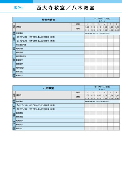 西大寺教室/八木教室12/11(月)~12/15(金)121ターム34569:30〜11:0011:2013:4015:3017:2019:10〜〜〜〜〜12:5015:1017:0018:5020:40映像授業の講座一覧は、108ページをご参照ください。12/11(月)~12/15(金)121ターム34569:30〜11:0011:2013:4015:3017:2019:10〜〜〜〜〜12:5015:1017:0018:5020:40映像授業の講座一覧は、108ページをご参照ください。時限時間時限時間西大寺教室講座名教科映像講座映像【ダイジェスト】冬から始める入試対策英語(難関)【ダイジェスト】冬から始める入試対策数学(難関)特別選抜英語難関英語標準英語特別選抜数学難関数学標準数学難関現代文標準古文難関化学総合英語数学国語理科八木教室講座名教科映像講座映像【ダイジェスト】冬から始める入試対策英語(難関)【ダイジェスト】冬から始める入試対策数学(難関)難関英語標準英語難関数学標準数学標準古文総合英語数学国語●2023年度/冬期講習/近畿/西大寺/高2生/パターン24352023_57_5_535_32_20230721091322.csv/1ページ校了時削除