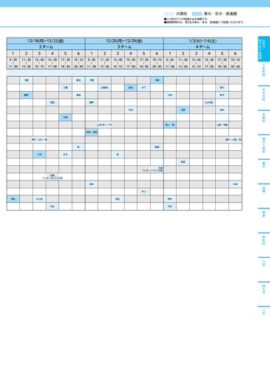 大阪校/東大・京大・医進館上本町校天王寺校京都校神戸三宮校豊中高槻堺東岸和田三田西大寺八木12/18(月)~12/22(金)122ターム34561212/25(月)~12/29(金)3ターム3456121/2(火)~1/6(土)4ターム34569:30〜11:0011:2013:4015:3017:2019:10〜〜〜〜〜12:5015:1017:0018:5020:409:30〜11:0011:2013:4015:3017:2019:1012:5015:1017:0018:5020:40〜〜〜〜〜9:30〜11:0011:2013:4015:3017:2019:10〜〜〜〜〜12:5015:1017:0018:5020:40刀藤野信岡刀中崎国松刀信岡藤野伊賀・幸重胡摩﨑国松木下刀中田平田北野香川影平畑中山本(敏)山本(ま)・八木阪上・畑山崎・幸重青木・山口・畑畑中・山崎・畑乾高橋小松古川西加賀12/18〜20の3日間宮本中田西尾本瀬12/25〜27の3日間高松中土居高松河合井上高松河合