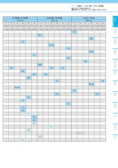 大阪校/東大・京大・医進館上本町校天王寺校京都校神戸三宮校豊中高槻堺東岸和田三田西大寺八木12/18(月)~12/22(金)122ターム34561212/25(月)~12/29(金)3ターム3456121/2(火)~1/6(土)4ターム34569:30〜11:0011:2013:4015:3017:2019:10〜〜〜〜〜12:5015:1017:0018:5020:409:30〜11:0011:2013:4015:3017:2019:1012:5015:1017:0018:5020:40〜〜〜〜〜9:30〜11:0011:2013:4015:3017:2019:10〜〜〜〜〜12:5015:1017:0018:5020:40阪上・幸重瀬戸山胡摩﨑宮本刀刀瀬戸山西浦寺尾大西(正)木下吉田別宮影山井上藤野大西(正)河野西浦畑中・山崎大西(正)池谷藤野河村木村西内一番合戦・山崎・畑島原中崎・松尾中崎藤野小倉江本島原影山藤野西尾江本河村