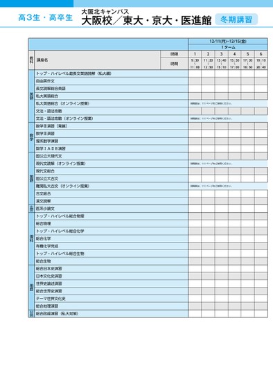 12/11(月)~12/15(金)121ターム34569:30〜11:0011:2013:4015:3017:2019:10〜〜12:5015:1017:0018:5020:40〜〜〜時間割は、111ページをご参照ください。時間割は、111ページをご参照ください。時間割は、111ページをご参照ください。時間割は、111ページをご参照ください。時限時間トップ・ハイレベル超長文英語読解(私大編)自由英作文長文読解総合英語私大英語総合私大英語総合(オンライン授業)文法・語法攻略文法・語法攻略(オンライン授業)数学Ⅲ演習[発展]数学Ⅲ演習理系数学演習数学ⅠAⅡB演習国公立大現代文現代文読解(オンライン授業)現代文総合国公立大古文難関私大古文(オンライン授業)古文総合漢文読解医系小論文トップ・ハイレベル総合物理総合物理トップ・ハイレベル総合化学総合化学有機化学完成トップ・ハイレベル総合生物総合生物総合日本史演習日本文化史演習世界史論述演習総合世界史演習テーマ世界文化史総合地理演習総合政経演習(私大対策)英語数学国語小論文理科地歴公民講座名教科●2023年度/冬期講習/近畿/大阪/高3・卒生/パターン24402023_57_5_511_11_20230809171315.csv/4ページ校了時削除