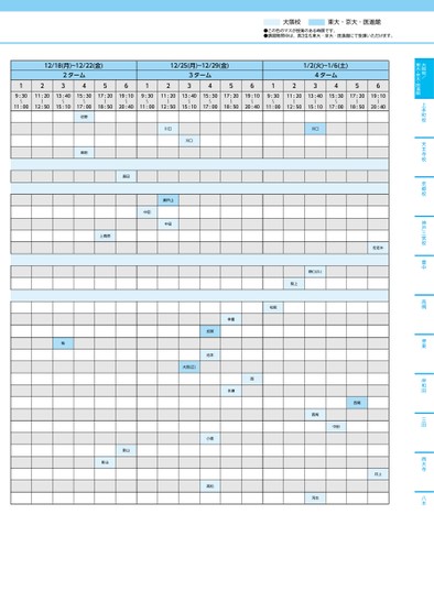 大阪校/東大・京大・医進館上本町校天王寺校京都校神戸三宮校豊中高槻堺東岸和田三田西大寺八木12/18(月)~12/22(金)122ターム34561212/25(月)~12/29(金)3ターム3456121/2(火)~1/6(土)4ターム34569:30〜11:0011:2013:4015:3017:2019:10〜〜〜〜〜12:5015:1017:0018:5020:409:30〜11:0011:2013:4015:3017:2019:1012:5015:1017:0018:5020:40〜〜〜〜〜9:30〜11:0011:2013:4015:3017:2019:10〜〜〜〜〜12:5015:1017:0018:5020:40佐野島田乾川口川口川口島田中田瀬戸山中田上高原影山影山佐佐木野口(た)阪上西尾西尾中田井上河合松尾幸重西本瀬大西(正)加賀池本小倉高松