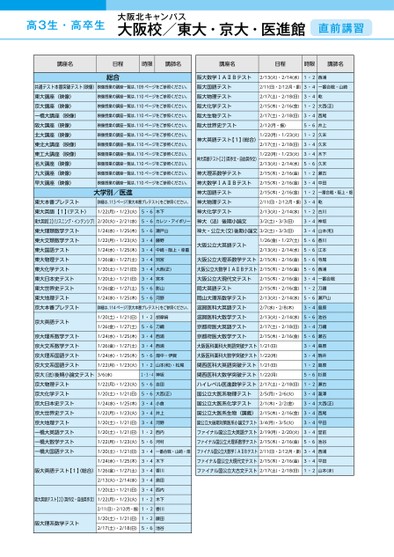 高3生・高卒生大阪北キャンパス大阪校/東大・京大・医進館直前講習講座名日程時限講師名講座名日程時限講師名阪大数学ⅠAⅡBテスト阪大国語テスト阪大物理テスト阪大化学テスト阪大生物テスト阪大世界史テスト神大英語テスト【1】総合)神大英語テスト【2】英作文・自由英作文)2/13(火)・2/14(水)1・2西浦2/11(日)・2/12(月・振)3・4一番合戦・山崎2/17(土)・2/18(日)3・4乾2/15(木)・2/16(金)1・2大西(正)2/17(土)・2/18(日)3・4西尾2/12(月・振)5・6井上1/22(月)・1/23(火)1・2久末2/17(土)・2/18(日)3・4久末1/22(月)・1/23(火)3・4木下2/13(火)・2/14(水)5・6久末2/15(木)・2/16(金)2/15(木)・2/16(金)2/15(木)・2/16(金)神大理系数学テスト神大数学ⅠAⅡBテスト神大国語テスト神大物理テスト神大化学テスト神大(法)後期小論文神大・公立大(文)後期小論文3/2(土)・3/3(日)3/2(土)・3/3(日)2/13(火)・2/14(水)2/11(日)・2/12(月・振)1・2瀬古3・4中田1・2一番合戦・阪上・畑3・4乾1・2古川3・4神坂3・4山本(和)大阪公立大英語テスト大阪公立大理系数学テスト大阪公立大数学ⅠAⅡBテスト大阪公立大現代文テスト岡大英語テスト岡山大理系数学テスト滋賀医科大英語テスト滋賀医科大数学テスト京都府医大英語テスト京都府医大数学テスト大阪医科薬科大英語突破テスト大阪医科薬科大数学突破テスト関西医科大英語突破テスト関西医科大数学突破テストハイレベル医進数学テスト国公立大医系物理テスト国公立大医系化学テスト国公立大医系生物(講義)国公立大後期対策医系小論文テストファイナル国公立大英語テストファイナル国公立大理系数学テストファイナル国公立大数学ⅠAⅡBテストファイナル国公立大現代文テストファイナル国公立大古文テスト1/26(金)・1/27(土)5・6香川2/13(火)・2/14(水)5・6江本2/15(木)・2/16(金)5・6寺尾2/15(木)・2/16(金)5・6西浦2/15(木)・2/16(金)3・4一番合戦2/15(木)・2/16(金)1・2刀2/13(火)・2/14(水)5・6瀬戸山2/7(水)・2/8(木)3・4島原2/13(火)・2/14(水)5・6池谷2/17(土)・2/18(日)3・4刀2/15(木)・2/16(金)5・6瀬古1/21(日)1/22(月)1/21(日)1/22(月)3・4島原3・4駒井1・2島原5・6杉原2/17(土)・2/18(日)1・2瀬古2/5(月)・2/6(火)3・4瀧澤2/1(木)・2/2(金)3・4大西(正)2/15(木)・2/16(金)3・4西尾3/4(月)・3/5(火)3・4平田2/19(月)・2/20(火)3・4堂前2/15(木)・2/16(金)5・6池谷2/11(日)・2/12(月・振)3・4西浦2/15(木)・2/16(金)3・4平田2/17(土)・2/18(日)1・2山本(ま)1/24(水)・1/25(木)1/22(月)・1/23(火)1/22(月)・1/23(火)東大本番プレテスト東大英語【1】テスト)東大英語【2】リスニング・インテンシブ)2/20(火)・2/21(水)東大理類数学テスト東大文類数学テスト東大国語テスト東大物理テスト東大化学テスト東大日本史テスト東大世界史テスト東大地理テスト京大本番プレテスト1/26(金)・1/27(土)1/20(土)・1/21(日)1/20(土)・1/21(日)1/26(金)・1/27(土)1/24(水)・1/25(木)1/24(水)・1/25(木)5・6木下5・6カレン・アイボリー5・6瀬戸山3・4藤野3・4中崎・阪上・幸重3・4別宮3・4大西(正)3・4宮本5・6影山5・6河野総合映像授業の講座一覧は、110ページをご参照ください。映像授業の講座一覧は、110ページをご参照ください。映像授業の講座一覧は、110ページをご参照ください。共通テスト本番突破テスト(映像)映像授業の講座一覧は、109ページをご参照ください。東大講座(映像)京大講座(映像)一橋大講座(映像)阪大講座(映像)北大講座(映像)東北大講座(映像)東工大講座(映像)名大講座(映像)九大講座(映像)早大講座(映像)映像授業の講座一覧は、110ページをご参照ください。映像授業の講座一覧は、110ページをご参照ください。映像授業の講座一覧は、110ページをご参照ください。映像授業の講座一覧は、110ページをご参照ください。映像授業の講座一覧は、110ページをご参照ください。映像授業の講座一覧は、110ページをご参照ください。映像授業の講座一覧は、110ページをご参照ください。大学別/医進詳細は、113ページ「東大本番プレテスト」をご参照ください。詳細は、114ページ「京大本番プレテスト」をご参照ください。京大英語テスト京大理系数学テスト京大文系数学テスト京大理系国語テスト京大文系国語テスト京大(法)後期小論文テスト京大物理テスト京大化学テスト京大日本史テスト京大世界史テスト京大地理テスト一橋大英語テスト一橋大数学テスト一橋大国語テスト1/20(土)・1/21(日)1・2胡摩﨑1/26(金)・1/27(土)5・6刀1/24(水)・1/25(木)3・4西浦1/26(金)・1/27(土)3・4西浦1/24(水)・1/25(木)5・6畑中・伊賀1/22(月)・1/23(火)1・2山本(和)・松尾3/6(水)2・3・4神坂1/22(月)・1/23(火)5・6吉田1/20(土)・1/21(日)5・6大西(正)1/24(水)・1/25(木)3・4小倉1/22(月)・1/23(火)3・4井上1/20(土)・1/21(日)3・4河野1/20(土)・1/21(日)1・2西内1/22(月)・1/23(火)5・6河村1/20(土)・1/21(日)3・4一番合戦・山崎・畑1/24(水)・1/25(木)3・4木下阪大英語テスト【1】総合)1/26(金)・1/27(土)3・4香川2/13(火)・2/14(水)3・4島田1/20(土)・1/21(日)3・4西内阪大英語テスト【2】英作文・自由英作文)1/22(月)・1/23(火)1・2木下阪大理系数学テスト2/11(日)・2/12(月・振)1・2香川1/20(土)・1/21(日)1・2藤田2/17(土)・2/18(日)5・6池谷1ページ●2023年度/直前講習/近