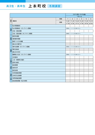 12/11(月)~12/15(金)121ターム34569:30〜11:0011:2013:4015:3017:2019:10〜〜12:5015:1017:0018:5020:40〜〜〜時間割は、111ページをご参照ください。時間割は、111ページをご参照ください。時間割は、111ページをご参照ください。時間割は、111ページをご参照ください。上本町校冬期講習時限時間講座名私大英語総合私大英語総合(オンライン授業)文法・語法攻略文法・語法攻略(オンライン授業)数学Ⅲ演習理系数学演習数学ⅠAⅡB演習国公立大現代文現代文読解(オンライン授業)現代文総合国公立大古文難関私大古文(オンライン授業)古文総合人文・教育系小論文医系小論文総合物理総合化学総合生物日本史論述演習日本文化史演習世界史論述演習総合政経演習(私大対策)教科英語数学国語小論文理科地歴・公民●2023年度/冬期講習/近畿/上本町/高3・卒生/パターン24402023_57_5_513_11_20230809172602.csv/3ページ校了時削除