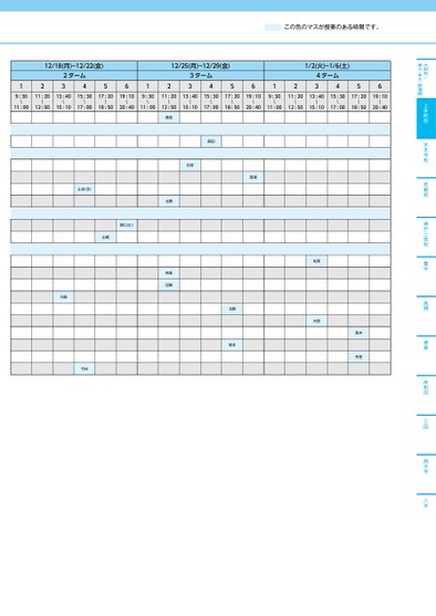 大阪校/東大・京大・医進館上本町校天王寺校京都校神戸三宮校豊中高槻堺東岸和田三田西大寺八木12/18(月)~12/22(金)122ターム34561212/25(月)~12/29(金)3ターム3456121/2(火)~1/6(土)4ターム34569:30〜11:0011:2013:4015:3017:2019:10〜〜〜〜〜12:5015:1017:0018:5020:409:30〜11:0011:2013:4015:3017:2019:1012:5015:1017:0018:5020:40〜〜〜〜〜9:30〜11:0011:2013:4015:3017:2019:10〜〜〜〜〜12:5015:1017:0018:5020:40島田北野神坂加賀山本(洋)野口(た)山崎川崎竹村島田杉原西浦松尾大西高木寺田北野宮本