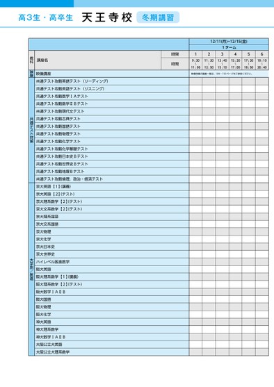 12/11(月)~12/15(金)121ターム34569:30〜11:0011:2013:4015:3017:2019:10〜〜12:5015:1017:0018:5020:40〜〜〜映像授業の講座一覧は、109・110ページをご参照ください。天王寺校冬期講習時限時間講座名映像講座共通テスト攻略英語テスト(リーディング)共通テスト攻略英語テスト(リスニング)共通テスト攻略数学ⅠAテスト共通テスト攻略数学ⅡBテスト共通テスト攻略現代文テスト共通テスト攻略古典テスト共通テスト攻略国語テスト共通テスト攻略物理テスト共通テスト攻略化学テスト共通テスト攻略化学基礎テスト共通テスト攻略日本史Bテスト共通テスト攻略世界史Bテスト共通テスト攻略地理Bテスト共通テスト攻略倫理,政治・経済テスト京大英語【1】講義)京大英語【2】テスト)京大理系数学【2】テスト)京大文系数学【2】テスト)京大理系国語京大文系国語京大物理京大化学京大日本史京大世界史ハイレベル医進数学阪大英語阪大理系数学【1】講義)阪大理系数学【2】テスト)阪大数学ⅠAⅡB阪大国語阪大物理阪大化学神大英語神大理系数学神大数学ⅠAⅡB大阪公立大英語大阪公立大理系数学教科映像共通テスト対策大学別/医進●2023年度/冬期講習/近畿/天王寺/高3・卒生/パターン24402023_57_5_515_11_20230718182124.csv/1ページ校了時削除