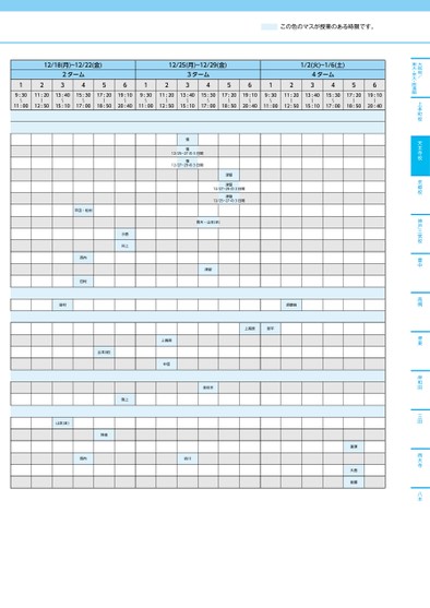 大阪校/東大・京大・医進館上本町校天王寺校京都校神戸三宮校豊中高槻堺東岸和田三田西大寺八木12/18(月)~12/22(金)122ターム34561212/25(月)~12/29(金)3ターム3456121/2(火)~1/6(土)4ターム34569:30〜11:0011:2013:4015:3017:2019:10〜〜〜〜〜12:5015:1017:0018:5020:409:30〜11:0011:2013:4015:3017:2019:1012:5015:1017:0018:5020:40〜〜〜〜〜9:30〜11:0011:2013:4015:3017:2019:10〜〜〜〜〜12:5015:1017:0018:5020:40慎慎12/25~27の3日間慎12/27~29の3日間津留津留12/27~29の3日間津留12/25~27の3日間青木・山本(ま)津留胡摩﨑上高原影平上高原中田佐佐木平田・松村西内田村田村山本(紀)山本(ま)神坂小倉井上阪上岡内古川瀧澤大西後藤