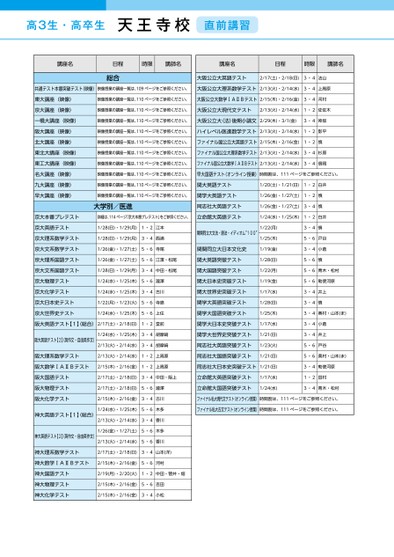 天王寺校直前講習講座名日程時限講師名講座名日程時限講師名総合大阪公立大英語テスト2/17(土)・2/18(日)3・4法山共通テスト本番突破テスト(映像)映像授業の講座一覧は、109ページをご参照ください。大阪公立大理系数学テスト2/13(火)・2/14(水)3・4上高原東大講座(映像)京大講座(映像)映像授業の講座一覧は、110ページをご参照ください。大阪公立大数学ⅠAⅡBテスト2/15(木)・2/16(金)3・4河村映像授業の講座一覧は、110ページをご参照ください。大阪公立大現代文テスト2/13(火)・2/14(水)1・2佐佐木一橋大講座(映像)映像授業の講座一覧は、110ページをご参照ください。大阪公立大(法)後期小論文2/29(木)・3/1(金)3・4神坂映像授業の講座一覧は、110ページをご参照ください。ハイレベル医進数学テスト2/13(火)・2/14(水)1・2影平映像授業の講座一覧は、110ページをご参照ください。ファイナル国公立大英語テスト2/15(木)・2/16(金)1・2慎映像授業の講座一覧は、110ページをご参照ください。ファイナル国公立大理系数学テスト2/13(火)・2/14(水)3・4杉原映像授業の講座一覧は、110ページをご参照ください。ファイナル国公立大数学ⅠAⅡBテスト2/13(火)・2/14(水)3・4信岡映像授業の講座一覧は、110ページをご参照ください。早大国語テスト(オンライン授業)時間割は、111ページをご参照ください。映像授業の講座一覧は、110ページをご参照ください。映像授業の講座一覧は、110ページをご参照ください。大学別/医進詳細は、114ページ「京大本番プレテスト」をご参照ください。関大英語テスト関学大英語テスト同志社大英語テスト立命館大英語テスト1/20(土)・1/21(日)1・2白井1/26(金)・1/27(土)1・2慎1/26(金)・1/27(土)3・4慎1/24(水)・1/25(木)1・2白井阪大講座(映像)北大講座(映像)東北大講座(映像)東工大講座(映像)名大講座(映像)九大講座(映像)早大講座(映像)京大本番プレテスト京大英語テスト京大理系数学テスト京大文系数学テスト京大理系国語テスト京大文系国語テスト京大物理テスト京大化学テスト京大日本史テスト京大世界史テスト阪大数学ⅠAⅡBテスト2/15(木)・2/16(金)1・2上高原同志社大日本史突破テスト1/21(日)関関同立大文法・語法・イディオム“100”関関同立大日本文化史関大英語突破テスト関大国語突破テスト関大日本史突破テスト関大世界史突破テスト関学大英語突破テスト関学大国語突破テスト関学大日本史突破テスト関学大世界史突破テスト同志社大英語突破テスト同志社大国語突破テスト1/22(月)1/25(木)1/19(金)1/28(日)1/22(月)1/19(金)1/17(水)1/28(日)1/25(木)1/17(水)1/21(日)1/23(火)1/21(日)立命館大英語突破テスト立命館大国語突破テスト1/17(水)1/24(水)3・4慎5・6戸谷3・4小倉5・6慎5・6青木・松村5・6勅使河原3・4井上3・4慎3・4奥村・山本(ま)3・4小倉3・4井上5・6戸谷5・6奥村・山本(ま)3・4勅使河原1・2田村3・4青木・松村ファイナル私大現代文テスト(オンライン授業)時間割は、111ページをご参照ください。ファイナル私大古文テスト(オンライン授業)時間割は、111ページをご参照ください。1/28(日)・1/29(月)1・2江本1/28(日)・1/29(月)3・4西浦1/26(金)・1/27(土)5・6寺尾1/26(金)・1/27(土)5・6江濵・松尾1/28(日)・1/29(月)3・4中田・松尾1/24(水)・1/25(木)5・6瀧澤1/24(水)・1/25(木)3・4古川1/22(月)・1/23(火)5・6寺島1/24(水)・1/25(木)5・6上住阪大英語テスト【1】総合)2/17(土)・2/18(日)1・2堂前阪大英語テスト【2】英作文・自由英作文)1/24(水)・1/25(木)3・4胡摩﨑2/13(火)・2/14(水)3・4胡摩﨑阪大理系数学テスト2/13(火)・2/14(水)1・2上高原阪大国語テスト阪大物理テスト阪大化学テスト神大英語テスト【1】総合)神大英語テスト【2】英作文・自由英作文)2/17(土)・2/18(日)3・4中田・阪上2/17(土)・2/18(日)5・6瀧澤2/15(木)・2/16(金)3・4古川1/24(水)・1/25(木)5・6木多2/13(火)・2/14(水)3・4香川1/26(金)・1/27(土)5・6木多2/13(火)・2/14(水)5・6香川神大理系数学テスト2/17(土)・2/18(日)3・4山本(洋)神大数学ⅠAⅡBテスト2/15(木)・2/16(金)5・6河村神大国語テスト神大物理テスト神大化学テスト2/19(月)・2/20(火)1・2中田・菅井・畑2/15(木)・2/16(金)5・6吉田2/15(木)・2/16(金)3・4小松1ページ●2023年度/直前講習/近畿/天王寺/高3・卒生/パターン7043/2023_59_5_515_11_20230719153933.csv校了時削除