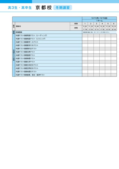 12/11(月)~12/15(金)121ターム34569:30〜11:0011:2013:4015:3017:2019:10〜〜12:5015:1017:0018:5020:40〜〜〜映像授業の講座一覧は、109・110ページをご参照ください。京都校冬期講習時限時間講座名映像講座共通テスト攻略英語テスト(リーディング)共通テスト攻略英語テスト(リスニング)共通テスト攻略数学ⅠAテスト共通テスト攻略数学ⅡBテスト共通テスト攻略現代文テスト共通テスト攻略古典テスト共通テスト攻略国語テスト共通テスト攻略物理テスト共通テスト攻略化学テスト共通テスト攻略日本史Bテスト共通テスト攻略世界史Bテスト共通テスト攻略地理Bテスト共通テスト攻略倫理,政治・経済テスト教科映像共通テスト対策●2023年度/冬期講習/近畿/京都/高3・卒生/パターン24402023_57_5_531_11_20230809172602.csv/1ページ校了時削除