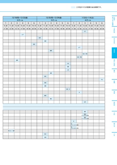 大阪校/東大・京大・医進館上本町校天王寺校京都校神戸三宮校豊中高槻堺東岸和田三田西大寺八木12/18(月)~12/22(金)122ターム34561212/25(月)~12/29(金)3ターム3456121/2(火)~1/6(土)4ターム34569:30〜11:0011:2013:4015:3017:2019:10〜〜〜〜〜12:5015:1017:0018:5020:409:30〜11:0011:2013:4015:3017:2019:1012:5015:1017:0018:5020:40〜〜〜〜〜9:30〜11:0011:2013:4015:3017:2019:10〜〜〜〜〜12:5015:1017:0018:5020:40片山木下山下中崎・伊賀中崎・伊賀白井堂前堂前1/2〜4の3日間堂前1/4〜6の3日間/4〜6の3日間谷1/2〜4の3日間谷1谷小松佐藤上住中崎・仲谷山下佐野島原西浦藤野島原瀬古瀬古堂前瀬尾藤田高木前田瀧澤野口(た)・塚野