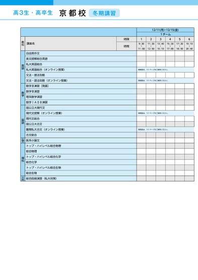 12/11(月)~12/15(金)121ターム34569:30〜11:0011:2013:4015:3017:2019:10〜〜12:5015:1017:0018:5020:40〜〜〜時間割は、111ページをご参照ください。時間割は、111ページをご参照ください。時間割は、111ページをご参照ください。時間割は、111ページをご参照ください。京都校冬期講習時限時間自由英作文長文読解総合英語私大英語総合私大英語総合(オンライン授業)文法・語法攻略文法・語法攻略(オンライン授業)数学Ⅲ演習[発展]数学Ⅲ演習理系数学演習数学ⅠAⅡB演習国公立大現代文現代文読解(オンライン授業)現代文総合国公立大古文難関私大古文(オンライン授業)古文総合医系小論文トップ・ハイレベル総合物理総合物理トップ・ハイレベル総合化学総合化学トップ・ハイレベル総合生物総合生物総合政経演習(私大対策)英語数学国語小論文理科公民講座名教科●2023年度/冬期講習/近畿/京都/高3・卒生/パターン24402023_57_5_531_11_20230809172602.csv/3ページ校了時削除