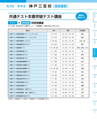 上本町校天王寺校京都校神戸三宮校豊中高槻堺東岸和田三田西大寺八木大阪校/東大・京大・医進館最後の総仕上げ高3生・高卒生神戸三宮校直前講習共通テスト本番突破テスト講座テスト+解説講義科目別講座テストの後、自己採点をして最終チェック!解説講義で、最後の総仕上げをします。 講座名日程時間担当講師共通テスト本番突破英語テスト(リーディング)1/9(火)16:10〜19:30共通テスト本番突破英語テスト(リスニング)1/9(火)19:50〜21:30国松国松1/10(水)12:50〜15:40山本(洋)1/10(水)19:00〜21:40駒井1/8(月・祝)12:20〜17:40畑中・松尾・八木共通テスト本番突破数学ⅠAテスト共通テスト本番突破数学ⅡBテスト共通テスト本番国語テスト共通テスト本番突破物理テスト共通テスト本番突破化学テスト共通テスト本番突破生物テスト共通テスト本番突破物理基礎テスト共通テスト本番突破化学基礎テスト共通テスト本番突破生物基礎テスト共通テスト本番突破地学基礎テスト共通テスト本番突破日本史Bテスト共通テスト本番突破世界史Bテスト共通テスト本番突破地理Bテスト共通テスト本番突破倫理テスト共通テスト本番突破政治・経済テスト1/7(日)15:30〜18:101/7(日)18:30〜21:101/7(日)15:30〜18:101/7(日)15:10〜16:501/7(日)17:10〜18:501/8(月・祝)10:00〜11:401/7(日)19:10〜20:501/10(水)16:00〜18:401/7(日)12:10〜14:501/9(火)13:10〜15:501/11(木)15:50〜18:301/11(木)18:50〜21:30乾岡内西尾中出古川西尾松永宮本寺田高松後藤河合竹村竹村共通テスト本番突破倫理,政治・経済テスト1/11(木)18:50〜21:30共通テスト本番突破現代社会テスト1/11(木)15:50〜18:30※共通テスト本番必勝テストと共通テスト本番突破テストの内容は重複しません。