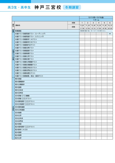 12/11(月)~12/15(金)121ターム34569:30〜11:0011:2013:4015:3017:2019:10〜〜12:5015:1017:0018:5020:40〜〜〜映像授業の講座一覧は、109・110ページをご参照ください。島原神戸三宮校冬期講習時限時間講座名映像講座共通テスト攻略英語テスト(リーディング)共通テスト攻略英語テスト(リスニング)共通テスト攻略数学ⅠAテスト共通テスト攻略数学ⅡBテスト共通テスト攻略現代文テスト共通テスト攻略古典テスト共通テスト攻略国語テスト共通テスト攻略物理テスト共通テスト攻略化学テスト共通テスト攻略生物テスト共通テスト攻略化学基礎テスト共通テスト攻略生物基礎テスト共通テスト攻略日本史Bテスト共通テスト攻略世界史Bテスト共通テスト攻略地理Bテスト共通テスト攻略倫理,政治・経済テスト東大英語東大理類数学東大文類数学東大国語東大日本史東大世界史京大英語【1】講義)京大英語【2】テスト)京大理系数学【2】テスト)京大文系数学【2】テスト)京大理系国語京大文系国語京大物理京大化学京大日本史京大世界史阪大英語阪大理系数学【2】テスト)阪大数学ⅠAⅡB阪大国語阪大物理阪大化学教科映像共通テスト対策大学別●2023年度/冬期講習/近畿/神戸三宮/高3・卒生/パターン24452023_57_5_514_11_20230720183803.csv/1ページ校了時削除