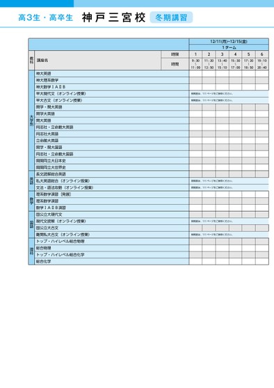 12/11(月)~12/15(金)121ターム34569:30〜11:0011:2013:4015:3017:2019:10〜〜12:5015:1017:0018:5020:40〜〜〜時間割は、111ページをご参照ください。時間割は、111ページをご参照ください。時間割は、111ページをご参照ください。時間割は、111ページをご参照ください。時間割は、111ページをご参照ください。時間割は、111ページをご参照ください。神戸三宮校冬期講習時限時間神大英語神大理系数学神大数学ⅠAⅡB早大現代文(オンライン授業)早大古文(オンライン授業)関学・関大英語関学大英語関大英語同志社・立命館大英語同志社大英語立命館大英語関学・関大国語同志社・立命館大国語関関同立大日本史関関同立大世界史長文読解総合英語私大英語総合(オンライン授業)文法・語法攻略(オンライン授業)理系数学演習[発展]理系数学演習数学ⅠAⅡB演習国公立大現代文現代文読解(オンライン授業)国公立大古文難関私大古文(オンライン授業)トップ・ハイレベル総合物理総合物理トップ・ハイレベル総合化学総合化学大学別英語数学国語理科講座名教科●2023年度/冬期講習/近畿/神戸三宮/高3・卒生/パターン24452023_57_5_514_11_20230720183803.csv/2ページ校了時削除