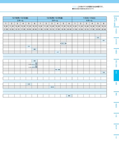 大阪校/東大・京大・医進館上本町校天王寺校京都校神戸三宮校豊中高槻堺東岸和田三田西大寺八木12/18(月)~12/22(金)122ターム34561212/25(月)~12/29(金)3ターム3456121/2(火)~1/6(土)4ターム34569:30〜11:0011:2013:4015:3017:2019:10〜〜〜〜〜12:5015:1017:0018:5020:409:30〜11:0011:2013:4015:3017:2019:1012:5015:1017:0018:5020:40〜〜〜〜〜9:30〜11:0011:2013:4015:3017:2019:10〜〜〜〜〜12:5015:1017:0018:5020:40吉田青木玉城白井瀬尾津留津留12/18~20の3日間津留12/20~22の3日間野口(良)・瀬島上村中田・瀬島杉原一番合戦瀬島