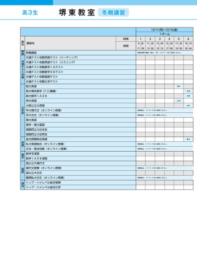 12/11(月)~12/15(金)121ターム34569:30〜11:0011:2013:4015:3017:2019:10〜〜12:5015:1017:0018:5020:40〜〜〜映像授業の講座一覧は、109・110ページをご参照ください。青木山内中田杉原山内青木時間割は、111ページをご参照ください。時間割は、111ページをご参照ください。時間割は、111ページをご参照ください。時間割は、111ページをご参照ください。時間割は、111ページをご参照ください。時間割は、111ページをご参照ください。堺東教室冬期講習時限時間講座名映像講座共通テスト攻略英語テスト(リーディング)共通テスト攻略英語テスト(リスニング)共通テスト攻略数学ⅠAテスト共通テスト攻略数学ⅡBテスト共通テスト攻略国語テスト共通テスト攻略化学テスト阪大英語阪大理系数学【1】講義)阪大数学ⅠAⅡB神大英語大阪公立大英語早大現代文(オンライン授業)早大古文(オンライン授業)関大英語関学・関大国語関関同立大日本史関関同立大世界史長文読解総合英語私大英語総合(オンライン授業)文法・語法攻略(オンライン授業)数学Ⅲ演習数学ⅠAⅡB演習国公立大現代文現代文読解(オンライン授業)国公立大古文難関私大古文(オンライン授業)トップ・ハイレベル総合物理トップ・ハイレベル総合化学教科映像共通テスト対策大学別英語数学国語理科●2023年度/冬期講習/近畿/堺東/高3・卒生/パターン24452023_57_5_533_11_20230718151430.csv/1ページ校了時削除