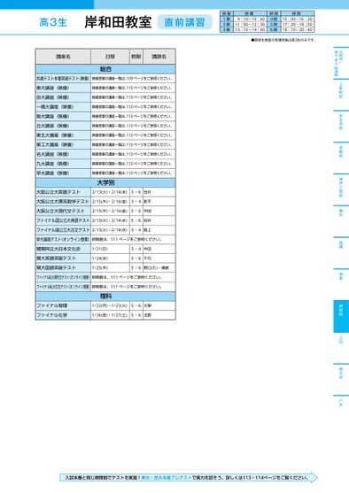 大阪校/東大・京大・医進館上本町校天王寺校京都校神戸三宮校豊中高槻堺東岸和田三田西大寺八木岸和田教室直前講習講座名日程時限講師名共通テスト本番突破テスト(映像)映像授業の講座一覧は、109ページをご参照ください。総合東大講座(映像)京大講座(映像)一橋大講座(映像)阪大講座(映像)北大講座(映像)東北大講座(映像)東工大講座(映像)名大講座(映像)九大講座(映像)早大講座(映像)映像授業の講座一覧は、110ページをご参照ください。映像授業の講座一覧は、110ページをご参照ください。映像授業の講座一覧は、110ページをご参照ください。映像授業の講座一覧は、110ページをご参照ください。映像授業の講座一覧は、110ページをご参照ください。映像授業の講座一覧は、110ページをご参照ください。映像授業の講座一覧は、110ページをご参照ください。映像授業の講座一覧は、110ページをご参照ください。映像授業の講座一覧は、110ページをご参照ください。映像授業の講座一覧は、110ページをご参照ください。大学別大阪公立大英語テスト2/13(火)・2/14(水)5・6白井大阪公立大理系数学テスト2/15(木)・2/16(金)3・4影平大阪公立大現代文テスト2/15(木)・2/16(金)5・6中田ファイナル国公立大英語テスト2/13(火)・2/14(水)5・6松井ファイナル国公立大古文テスト2/13(火)・2/14(水)3・4阪上早大国語テスト(オンライン授業)時間割は、111ページをご参照ください。関関同立大日本文化史関大英語突破テスト関大国語突破テスト1/21(日)1/24(水)1/25(木)3・4中田5・6千代5・6野口(た)・瀬島ファイナル私大現代文テスト(オンライン授業)時間割は、111ページをご参照ください。ファイナル私大古文テスト(オンライン授業)時間割は、111ページをご参照ください。理科ファイナル物理ファイナル化学1/22(月)・1/23(火)5・6大學1/26(金)・1/27(土)5・6北野1ページ●2023年度/直前講習/近畿/岸和田/高3・卒生/パターン7043/2023_59_5_564_11_20230724095654.csv校了時削除