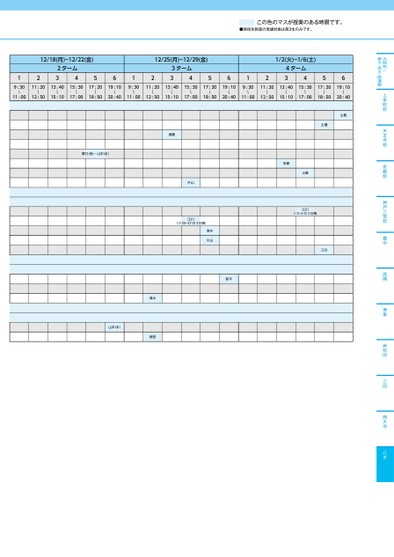 大阪校/東大・京大・医進館上本町校天王寺校京都校神戸三宮校豊中高槻堺東岸和田三田西大寺八木12/18(月)~12/22(金)122ターム34561212/25(月)~12/29(金)3ターム3456121/2(火)~1/6(土)4ターム34569:30〜11:0011:2013:4015:3017:2019:10〜〜〜〜〜12:5015:1017:0018:5020:409:30〜11:0011:2013:4015:3017:2019:1012:5015:1017:0018:5020:40〜〜〜〜〜9:30〜11:0011:2013:4015:3017:2019:10〜〜〜〜〜12:5015:1017:0018:5020:40土橋土橋本瀬土橋江川1/2~4の3日間江川野口(良)・山本(ま)進藤片山江川12/25~27の3日間高木片山影平青木植田山本(ま)