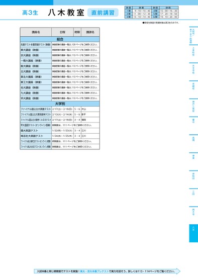 大阪校/東大・京大・医進館上本町校天王寺校京都校神戸三宮校豊中高槻堺東岸和田三田西大寺八木八木教室直前講習講座名日程時限講師名共通テスト本番突破テスト(映像)映像授業の講座一覧は、109ページをご参照ください。総合東大講座(映像)京大講座(映像)一橋大講座(映像)阪大講座(映像)北大講座(映像)東北大講座(映像)東工大講座(映像)名大講座(映像)九大講座(映像)早大講座(映像)映像授業の講座一覧は、110ページをご参照ください。映像授業の講座一覧は、110ページをご参照ください。映像授業の講座一覧は、110ページをご参照ください。映像授業の講座一覧は、110ページをご参照ください。映像授業の講座一覧は、110ページをご参照ください。映像授業の講座一覧は、110ページをご参照ください。映像授業の講座一覧は、110ページをご参照ください。映像授業の講座一覧は、110ページをご参照ください。映像授業の講座一覧は、110ページをご参照ください。映像授業の講座一覧は、110ページをご参照ください。大学別ファイナル国公立大英語テスト2/17(土)・2/18(日)5・6片山ファイナル国公立大理系数学テスト2/13(火)・2/14(水)5・6影平ファイナル国公立大数学ⅠAⅡBテスト2/17(土)・2/18(日)3・4信岡早大国語テスト(オンライン授業)時間割は、111ページをご参照ください。関大英語テスト同志社大英語テスト1/22(月)・1/23(火)3・4江川1/24(水)・1/25(木)3・4江川ファイナル私大現代文テスト(オンライン授業)時間割は、111ページをご参照ください。ファイナル私大古文テスト(オンライン授業)時間割は、111ページをご参照ください。1ページ●2023年度/直前講習/近畿/八木/高3・卒生/パターン7043/2023_59_5_538_11_20230724095654.csv校了時削除