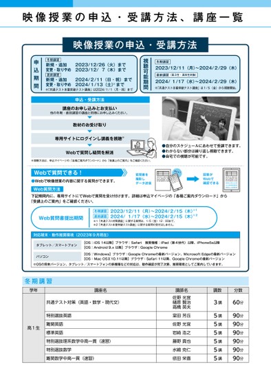 映像授業の申込・受講方法、講座一覧映像授業の申込・受講方法冬期講習2023/12/11(月)〜2024/2/29(木)直前講習(高3生・高卒生対象)2024/1/17(水)〜2024/2/29(木)※「共通テスト本番突破テスト講座」は1/5(金)から視聴開始。視聴可能期間申込期間冬期講習新規・追加2023/12/26(火)まで変更・取りやめ2023/12/7(木)まで直前講習新規・追加2024/2/11(日・祝)まで変更・取りやめ2024/1/13(土)※まで※「共通テスト本番突破テスト講座」は2024/1/1(月・祝)まで申込・受講方法講座のお申し込みとお支払い他の冬期・直前講習の講座と同様にお申し込みください。教材のお受け取り専用サイトにログインし講義を視聴※Webで質問し疑問を解消※視聴方法は、申込マイページの「各種ご案内ダウンロード」から「受講上のご案内」をご確認ください。●自分のスケジュールにあわせて受講できます。●わからない部分は繰り返し視聴できます。●自宅での視聴が可能です。Webで質問できる!●Webで映像授業の内容に関する質問ができます。Web質問方法質問書を撮影しデータ送信カシャ!回答がWebで確認できる下記期間内に、専用サイトにてWebで質問を受け付けます。詳細は申込マイページの「各種ご案内ダウンロード」から「受講上のご案内」をご確認ください。Web質問書提出期間2023/12/11(月)〜2024/2/15(木)※12024/1/17(水)〜2024/2/15(木)※2冬期講習直前講習※1「共通テスト対策講座」に関する質問は、1/5(金)12:00まで。※2「共通テスト本番突破テスト講座」に関する質問の受付はしません。対応端末・動作推奨環境(2023年9月現在)タブレット/スマートフォン【OS:iOS14以降】ブラウザ:Safari推奨機種:iPad(第4世代)以降、iPhone5s以降【OS:Android9.x以降】ブラウザ:GoogleChromeパソコン【OS:Windows】ブラウザ:GoogleChromeの最新バージョン、MicrosoftEdgeの最新バージョン【OS:MacOSⅩ10.11以降】ブラウザ:Safari11以降、GoogleChromeの最新バージョン※OSの将来バージョン、タブレット/スマートフォンの新機種などの対応は、動作確認が完了次第、推奨環境としてご案内していきます。冬期講習学年講座名共通テスト対策(英語・数学・現代文)高1生特別選抜英語難関英語標準英語特別選抜理系数学中高一貫(速習)特別選抜数学難関数学中高一貫(速習)講師名佐野光宜樋原賢治高橋英夫室田芳丘佐野光宜岩崎浩之藤野真也水嶋克仁依田栄喜講数3講5講5講5講5講5講5講分数60分90分90分90分90分90分90分