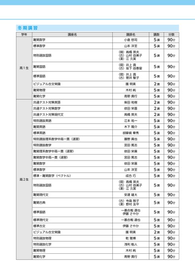 冬期講習学年講座名難関数学標準数学特別選抜国語高1生難関国語標準国語ビジュアル古文常識難関物理難関化学共通テスト対策英語共通テスト対策数学共通テスト対策現代文特別選抜英語難関英語標準英語特別選抜理系数学中高一貫(速習)特別選抜数学難関理系数学中高一貫(速習)難関数学中高一貫(速習)難関数学標準数学標準・難関数学(ベクトル)高2生特別選抜国語難関現代文難関古典標準国語標準現代文標準古文ビジュアル古文常識特別選抜物理特別選抜化学難関物理難関化学講師名小倉悠司山本洋至(現)高橋英夫(古)山村由美子(漢)江久実(現)井上真(古)坂下由香里(現)井上真(古)菅井聖子園明美木村純青野貴行柴田祐樹依田栄喜高橋英夫江本祐一木下陽介胡摩﨑章秀藤野真也宮田篤志依田栄喜宮田篤志依田栄喜山本洋至成合巧(現)高橋英夫(古)山村由美子(漢)江久実安達雄大(古)寺島智子(漢)野村友平一番合戦達也伊藤さやか一番合戦達也伊藤さやか園明美乾雅博浅利魁人木村純青野貴行講数5講5講5講5講5講2講5講5講2講2講2講5講5講5講5講5講5講5講5講5講5講5講5講5講5講5講5講2講5講5講5講5講分数90分90分90分90分90分90分90分90分90分90分90分90分90分90分90分90分90分90分90分90分90分90分90分90分90分90分90分90分90分90分90分90分