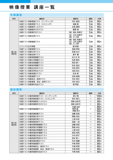 映像授業講座一覧冬期講習学年講座名共通テスト攻略英語テスト(リーディング)共通テスト攻略英語テスト(リスニング)共通テスト攻略数学ⅠAテスト共通テスト攻略数学ⅡBテスト共通テスト攻略現代文テスト高3生高卒生共通テスト攻略古典テスト共通テスト攻略国語テストビジュアル古文常識共通テスト攻略物理テスト共通テスト攻略化学テスト共通テスト攻略生物テスト共通テスト攻略物理基礎テスト共通テスト攻略化学基礎テスト共通テスト攻略生物基礎テスト共通テスト攻略地学基礎テスト共通テスト攻略日本史Bテスト共通テスト攻略世界史Bテスト共通テスト攻略地理Bテスト共通テスト攻略倫理テスト共通テスト攻略政治・経済テスト共通テスト攻略倫理,政治・経済テスト共通テスト攻略現代社会テスト直前講習学年講座名共通テスト本番突破英語テスト(リーディング)共通テスト本番突破英語テスト(リスニング)共通テスト本番突破数学ⅠAテスト共通テスト本番突破数学ⅡBテスト高3生高卒生共通テスト本番突破国語テスト共通テスト本番突破物理テスト共通テスト本番突破化学テスト共通テスト本番突破生物テスト共通テスト本番突破地学テスト共通テスト本番突破物理基礎テスト共通テスト本番突破化学基礎テスト共通テスト本番突破生物基礎テスト共通テスト本番突破地学基礎テスト共通テスト本番突破日本史Bテスト共通テスト本番突破世界史Bテスト共通テスト本番突破地理Bテスト共通テスト本番突破倫理テスト共通テスト本番突破政治・経済テスト共通テスト本番突破倫理,政治・経済テスト共通テスト本番突破現代社会テスト講師名市位星弥濱崎慧永島健徳秦野透(現)福永寿美子(古)山村由美子(漢)江久実(現)福永寿美子(古)山村由美子(漢)江久実園明美西浦秀和安達弘行唐牛穰佐々木哲松原隆志岸田章一松永昌治中垣秀作沼田英之松本聡吉見直倫河合英次河合英次栂明宏講師名清川舞安井稚乃高梨由多可高梨由多可松藤央記阿部順伊藤恭平加藤武昭岡島卓也三浦友史田島一成加藤武昭岡島卓也三浦友史前田祐利大内恭子坂本新一中井隆顕平尾則男平尾則男平尾則男平尾則男講数5講5講5講5講5講5講5講2講5講5講5講3講3講3講3講5講5講5講5講5講5講5講講数--------------------分数90分90分90分90分90分90分90分90分90分90分90分90分90分90分90分90分90分90分90分90分90分90分分数100分60分80分80分80分60分60分80分80分80分80分60分60分60分60分80分80分80分80分80分80分80分