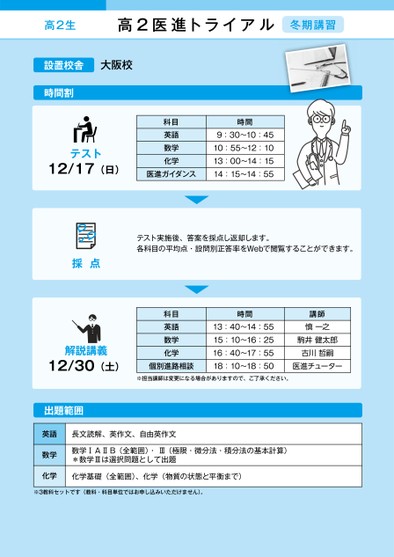 高2生高2医進トライアル冬期講習設置校舎大阪校時間割テスト12/17(日)科目英語数学化学医進ガイダンス時間9:30〜10:4510:55〜12:1013:00〜14:1514:15〜14:55テスト実施後、答案を採点し返却します。各科目の平均点・設問別正答率をWebで閲覧することができます。採点科目英語数学化学個別進路相談時間13:40〜14:5515:10〜16:2516:40〜17:5518:10〜18:50講師慎一之駒井健太郎古川哲嗣医進チューター※担当講師は変更になる場合がありますので、ご了承ください。解説講義12/30(土)出題範囲英語数学化学長文読解、英作文、自由英作文数学ⅠAⅡB(全範囲)・Ⅲ(極限・微分法・積分法の基本計算)*数学Ⅲは選択問題として出題化学基礎(全範囲)、化学(物質の状態と平衡まで)※3教科セットです(教科・科目単位ではお申し込みいただけません)。