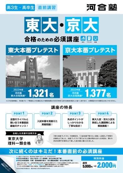 高3生・高卒生直前講習東京大学理科一類合格「東大本番プレテスト」の目標点を、「入試本番で取りたい点数」に設定して学習の計画を立てました。本番プレテストで思うように点数が取れなかった科目は、残りの約20日間で計画を立て直し入試本番に備えられました。合格した先輩の活用方法テストゼミ映像採点合格のための必須講座東大本番プレテスト京大本番プレテスト次に続くのはキミだ!本番直前の必須講座講座の特長全国のライバルと競い合う本番直前最後のチャンス!入試本番を見据えた実戦問題!失点ポイントがしっかりわかる丁寧な採点!東大入試・京大入試を熟知した講師陣による解説講義!POINT1POINT2POINT3POINT4東大・京大※この合格実績は、河合塾グループ関連法人の在籍生および講習受講生の2023年度入試の合格者を集計した延べ人数であり、公開模試のみの受験生は含んでおりません。1,321名河合塾東大合格実績※2023年度1,377名河合塾京大合格実績※2023年度特別料金5,000円2,000円(税込)通常※一般生で下記の方は、割引料金で受講できるクーポンが付与されます。●2024年度東大・京大入試オープン受験者(または申込完了者)●2023年度夏期・冬期・直前講習の東大・京大講座受講者(または申込完了者)※2023年度河合塾生は、塾生料金2,000円が適用されます。お申し込みにあたっては、上記の割引対象となる申し込みをされた際のログインⅠDまたはお客様ⅠDでお申し込みください。申込マイページの「>特典・クーポンを確認する」画面で割引料金のクーポンを確認できます。クーポンの付与を確認できない場合は、受講を希望する校舎窓口へお申し出ください。ここをめくって詳細をチェック!2023年度冬期・直前講習時間割高校生・高卒生