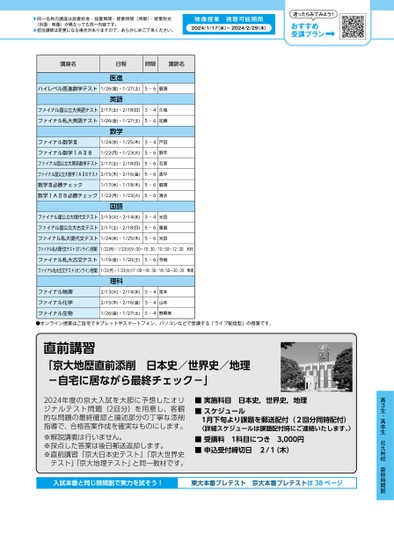 ▶同一名称の講座は設置校舎・設置期間・授業時間(時限)・授業形式(対面・映像)が異なっても同一内容です。▶担当講師は変更になる場合がありますので、あらかじめご了承ください。映像授業視聴可能期間2024/1/17(水)〜2024/2/29(木)迷ったらみてみよう!おすすめ受講プラン高3生・高卒生北九州校直前時間割2024年度の京大入試を大胆に予想したオリジナルテスト問題(2回分)を用意し、客観的な問題の最終確認と論述部分の丁寧な添削指導で、合格答案作成を確実なものにします。※解説講義は行いません。※採点した答案は後日郵送返却します。※直前講習「京大日本史テスト」「京大世界史テスト」「京大地理テスト」と同一教材です。■実施科目日本史,世界史,地理■スケジュール1月下旬より課題を郵送配付(2回分同時配付)〈詳細スケジュールは課題配付時にご連絡いたします。〉■受講料1科目につき3,000円■申込受付締切日2/1(木)入試本番と同じ時間割で実力を試そう!東大本番プレテスト京大本番プレテストは38ページ/●オンライン授業はご自宅でタブレットやスマートフォン、パソコンなどで受講する「ライブ配信型」の授業です。直前講習「京大地歴直前添削日本史/世界史/地理-自宅に居ながら最終チェック-」3ページ●2023年度/直前講習/九州/北九州校/高3・卒生/パターン7043/2023_59_7_744_11_20230803141303.csv校了時削除講座名日程時限講師名医進ハイレベル医進数学テスト1/26(金)・1/27(土)5・6龍頭英語ファイナル国公立大英語テスト2/17(土)・2/18(日)3・4久我ファイナル私大英語テスト1/26(金)・1/27(土)5・6加藤数学ファイナル数学Ⅲ1/24(水)・1/25(木)3・4戸田ファイナル数学ⅠAⅡB1/22(月)・1/23(火)5・6野竿ファイナル国公立大理系数学テスト2/17(土)・2/18(日)5・6石原ファイナル国公立大数学ⅠAⅡBテスト2/15(木)・2/16(金)5・6波平数学Ⅲ必勝チェック1/17(水)・1/18(木)5・6龍頭数学ⅠAⅡB必勝チェック1/22(月)・1/23(火)5・6清水国語ファイナル国公立大現代文テスト2/13(火)・2/14(水)3・4光田ファイナル国公立大古文テスト2/17(土)・2/18(日)5・6重盛ファイナル私大現代文テスト1/24(水)・1/25(木)5・6光田ファイナル私大現代文テスト(オンライン授業)1/22(月)・1/23(火)9:00〜10:30/10:50〜12:20木村ファイナル私大古文テスト1/19(金)・1/20(土)5・6寺島ファイナル私大古文テスト(オンライン授業)1/22(月)・1/23(火)17:00〜18:30/18:50〜20:20隼坂ファイナル物理ファイナル化学ファイナル生物理科2/13(火)・2/14(水)3・4宮本2/15(木)・2/16(金)3・4山本1/26(金)・1/27(土)3・4野黒美