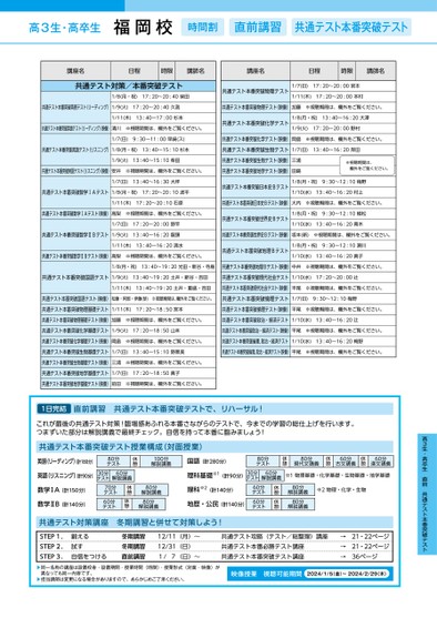 高3生・高卒生福岡校時間割直前講習共通テスト本番突破テスト講座名日程時限講師名講座名日程時限講師名共通テスト対策/本番突破テスト1/8(月・祝)17:20〜20:40柴田共通テスト本番突破物理テスト1/7(日)17:20〜20:00宮本1/11(木)17:20〜20:00本村共通テスト本番突破英語テスト(リーディング)1/9(火)17:20〜20:40久我共通テスト本番突破物理テスト(映像)加藤※視聴期間は、欄外をご覧ください。1/11(木)13:40〜17:00杉本共通テスト本番突破英語テスト(リーディング)映像)清川※視聴期間は、欄外をご覧ください。共通テスト本番突破英語テスト(リスニング)1/8(月・祝)13:40〜15:10杉本1/7(日)9:30〜11:00早﨑(ス)共通テスト本番突破英語テスト(リスニング)映像)安井※視聴期間は、欄外をご覧ください。1/9(火)13:40〜15:10柴田共通テスト本番突破化学テスト1/8(月・祝)13:40〜16:20大澤1/9(火)17:20〜20:00野村共通テスト本番突破化学テスト(映像)岡島共通テスト本番突破生物テスト共通テスト本番突破生物テスト(映像)三浦共通テスト本番突破地学テスト(映像)田島1/7(日)※視聴期間は、欄外をご覧ください。13:40〜16:20岸田※視聴期間は、欄外をご覧ください。共通テスト本番突破数学ⅠAテスト1/8(月・祝)17:20〜20:10波平1/7(日)13:40〜16:30大坪共通テスト本番突破日本史Bテスト1/8(月・祝)9:30〜12:10梅野1/10(水)13:40〜16:20村上1/11(木)17:20〜20:10石原共通テスト本番突破日本史Bテスト(映像)大内※視聴期間は、欄外をご覧ください。共通テスト本番突破数学ⅠAテスト(映像)高梨※視聴期間は、欄外をご覧ください。1/7(日)17:20〜20:00野竿共通テスト本番突破世界史Bテスト1/8(月・祝)9:30〜12:10植松1/10(水)13:40〜16:20青木共通テスト本番突破数学ⅡBテスト1/9(火)13:40〜16:20龍頭共通テスト本番突破世界史Bテスト(映像)坂本(新)※視聴期間は、欄外をご覧ください。共通テスト本番突破地理Bテスト1/8(月・祝)9:30〜12:10瀬川1/10(水)13:40〜16:20子※視聴期間は、欄外をご覧ください。1/7(日)9:30〜12:10梅野1/11(木)13:40〜16:20清水共通テスト本番突破数学ⅡBテスト(映像)高梨※視聴期間は、欄外をご覧ください。1/8(月・祝)13:40〜19:20光田・新谷・寺島共通テスト本番突破国語テスト1/9(火)13:40〜19:20土井・新谷・吉田1/11(木)13:40〜19:20土井・重盛・吉田1/11(木)共通テスト本番突破国語テスト(映像)松藤・阿部・伊藤(恭)共通テスト本番突破物理基礎テスト共通テスト本番突破物理基礎テスト(映像)加藤共通テスト本番突破化学基礎テスト共通テスト本番突破化学基礎テスト(映像)岡島共通テスト本番突破生物基礎テスト共通テスト本番突破生物基礎テスト(映像)三浦共通テスト本番突破地学基礎テスト共通テスト本番突破地学基礎テスト(映像)前田1/9(火)1/7(日)1/7(日)17:20〜18:50宮本※視聴期間は、欄外をご覧ください。17:20〜18:50山本※視聴期間は、欄外をご覧ください。13:40〜15:10野黒美※視聴期間は、欄外をご覧ください。17:20〜18:50子※視聴期間は、欄外をご覧ください。共通テスト本番突破地理Bテスト(映像)中井共通テスト本番突破現代社会テスト共通テスト本番突破現代社会テスト(映像)平尾共通テスト本番突破倫理テスト共通テスト本番突破倫理テスト(映像)平尾共通テスト本番突破政治・経済テスト共通テスト本番突破政治・経済テスト(映像)平尾共通テスト本番突破倫理,政治・経済テスト共通テスト本番突破倫理,政治・経済テスト(映像)平尾※視聴期間は、欄外をご覧ください。1/10(水)17:20〜20:00※視聴期間は、欄外をご覧ください。※視聴期間は、欄外をご覧ください。1/10(水)13:40〜16:20※視聴期間は、欄外をご覧ください。1/10(水)13:40〜16:20梅野※視聴期間は、欄外をご覧ください。高3生・高卒生直前共通テスト本番突破テスト60分漢文講義休憩60分古文講義休憩80分現代文講義休憩80分テスト国語(計280分)100分解説講義休憩80分テスト英語(リーディング)(計180分)共通テスト本番突破テスト授業構成(対面授業)1日完結直前講習共通テスト本番突破テストで、リハーサル!これが最後の共通テスト対策!臨場感あふれる本番さながらのテストで、今までの学習の総仕上げを行います。つまずいた部分は解説講義で最終チェック。自信を持って本番に臨みましょう!理科基礎※1(計90分)30分テスト60分解説講義※1物理基礎・化学基礎・生物基礎・地学基礎※2物理・化学・生物80分解説講義80分解説講義休憩休憩60分テスト60分テスト理科※2(計140分)地歴・公民(計140分)80分解説講義80分解説講義英語(リスニング)(計90分)30分テスト60分解説講義休憩休憩70分テスト60分テスト数学ⅠA(計150分)数学ⅡB(計140分)共通テスト対策講座冬期講習と併せて対策しよう!STEP1.STEP2.STEP3.12/11(月)~12/31(日)1/鍛える試す自信をつける冬期講習冬期講習直前講習7(日)~共通テスト攻略(テスト/総整理)講座共通テスト本番必勝テスト講座共通テスト本番突破テスト講座→21・22ページ→21・22ページ→36ページ▶同一名称の講座は設置校舎・設置期間・授業時間(時限)・授業形式(対面・映像)が異なっても同一内容です。▶担当講師は変更になる場合がありますので、あ