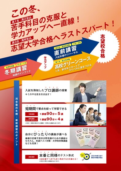 志望校合格高1生・高2生は、この冬、苦手科目の克服と学力アップへ一直線!志望大学合格へラストスパート!高3生・高卒生は、高3生・卒対1月〜3月象生高直前講習入試本番のリハーサル高校グリーンコースライバルに差をつける1月、新学年スタートで・高2生対象高1生学力アップ月1〜月21年学全象対冬期講習知識のインプット入試を熟知したプロ講師の授業キミのやる気を引き出す!短期間で要点を絞って学習できる冬期講習直前講習(高3生・高卒生のみ)1講座90分×5講1講座90分×4講※形式(授業分数または講数)の異なる講座もあります。自分にぴったりの講座が選べる基礎の定着や苦手分野克服のための講座はもちろん、共通テスト対策・大学別対策講座なども充実!直前講習本番と同様のテスト形式入試本番で1点でも多く得点する力を鍛える!※形式の異なる講座もあります。ズバリ!的中2024年度入試で類似の問題が続出※写真はイメージです。河合塾の冬期・直前講習のポイント
