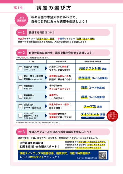 高1生講座の選び方Letʼs講座選択冬の目標や志望大学にあわせて、自分の目的にあった講座を受講しよう!STEP1受講する科目はコレ!●文系のキミは…「英語・数学・国語」●理系のキミは…「英語・数学・理科」受験への準備を着実に進めるために、入試で必要な科目を受講しよう!STEP2自分の目的にあわせ、講座を組み合わせて選択しよう!下のをして、受講講座を決めましょう。目的やるべき対策冬期講習おすすめ講座共通テスト対策にチャレンジ!共通テストの特徴をつかみ、先取り学習!共通テスト対策講座東大・京大・医学部医学科をめざしている最難関大入試レベルの問題で、傾向をつかむ!特別選抜(レベル別講座)得意科目を伸ばしたい苦手科目を克服したい今の学力からさらにレベルアップ!基礎からしっかり学ぶ!難関(レベル別講座)標準(レベル別講座)強化したいテーマ・分野がある特定のテーマ・分野に絞って対策!テーマ別講座忙しいけれど重要ポイントは押さえておきたい短期間で2学期の重要単元に絞って対策!ダイジェスト講座詳しくは6ページ※冬期講習を受講するために「テスト」を受ける必要はありません。STEP3受講スケジュールを決めて希望の講座を申し込もう!部活や学校、予習、復習のペースを考え、無理のないスケジュールを立てましょう。河合塾の冬期講習は12月8日(日)から順次スタート!受講開始までに余裕を持って受講講座を決めて、学習効果を高めるための「予習」ができるよう受講開始日の7日前までには申し込もう!講座ラインアップや設置校舎、授業形式、日程は時間割冊子もしくはWebサイトでチェック!Webサイトでの確認はこちら▶河合塾の講座を初めて受講する方におすすめ!