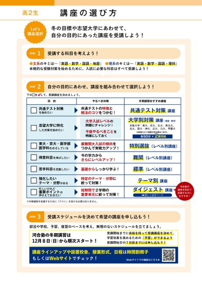 高2生講座の選び方Letʼs講座選択冬の目標や志望大学にあわせて、自分の目的にあった講座を受講しよう!STEP1受講する科目を考えよう!●文系のキミは…「英語・数学・国語・地歴」●理系のキミは…「英語・数学・国語・理科」本格的な受験対策を始めるために、入試に必要な科目はすべて受講しよう!STEP2自分の目的にあわせ、講座を組み合わせて選択しよう!下のをして、受講講座を決めましょう。やるべき対策冬期講習おすすめ講座苦手科目を克服したい基礎からしっかり学ぶ!強化したいテーマ・分野がある忙しいけれど重要ポイントは押さえておきたい特定のテーマ・分野に絞って対策!短期間で2学期の重要単元に絞って対策!※冬期講習を受講するために「テスト」を受ける必要はありません。STEP3受講スケジュールを決めて希望の講座を申し込もう!部活や学校、予習、復習のペースを考え、無理のないスケジュールを立てましょう。河合塾の冬期講習は12月8日(日)から順次スタート!受講開始までに余裕を持って受講講座を決めて、学習効果を高めるための「予習」ができるよう受講開始日の7日前までには申し込もう!講座ラインアップや設置校舎、授業形式、日程は時間割冊子もしくはWebサイトでチェック!Webサイトでの確認はこちら▶目的共通テスト対策を始めたい志望大学に特化した対策を始めたい東大・京大・医学部医学科をめざしている得意科目を伸ばしたい共通テストの特徴と解法のコツをつかむ!大学入試レベルの問題にチャレンジ!今後やるべきことを明確にしておく最難関大入試の傾向をつかんで実戦力アップ!今の学力からさらにレベルアップ!共通テスト対策講座大学別対策講座(英語・数学)対象大学:東大、京大、北大、東北大、名大、阪大・神大、広大、九大、早慶大※校舎により設置大学は異なります。各90分×2講完結特別選抜(レベル別講座)難関(レベル別講座)標準(レベル別講座)テーマ別講座ダイジェスト講座詳しくは8ページ河合塾の講座を初めて受講する方におすすめ!
